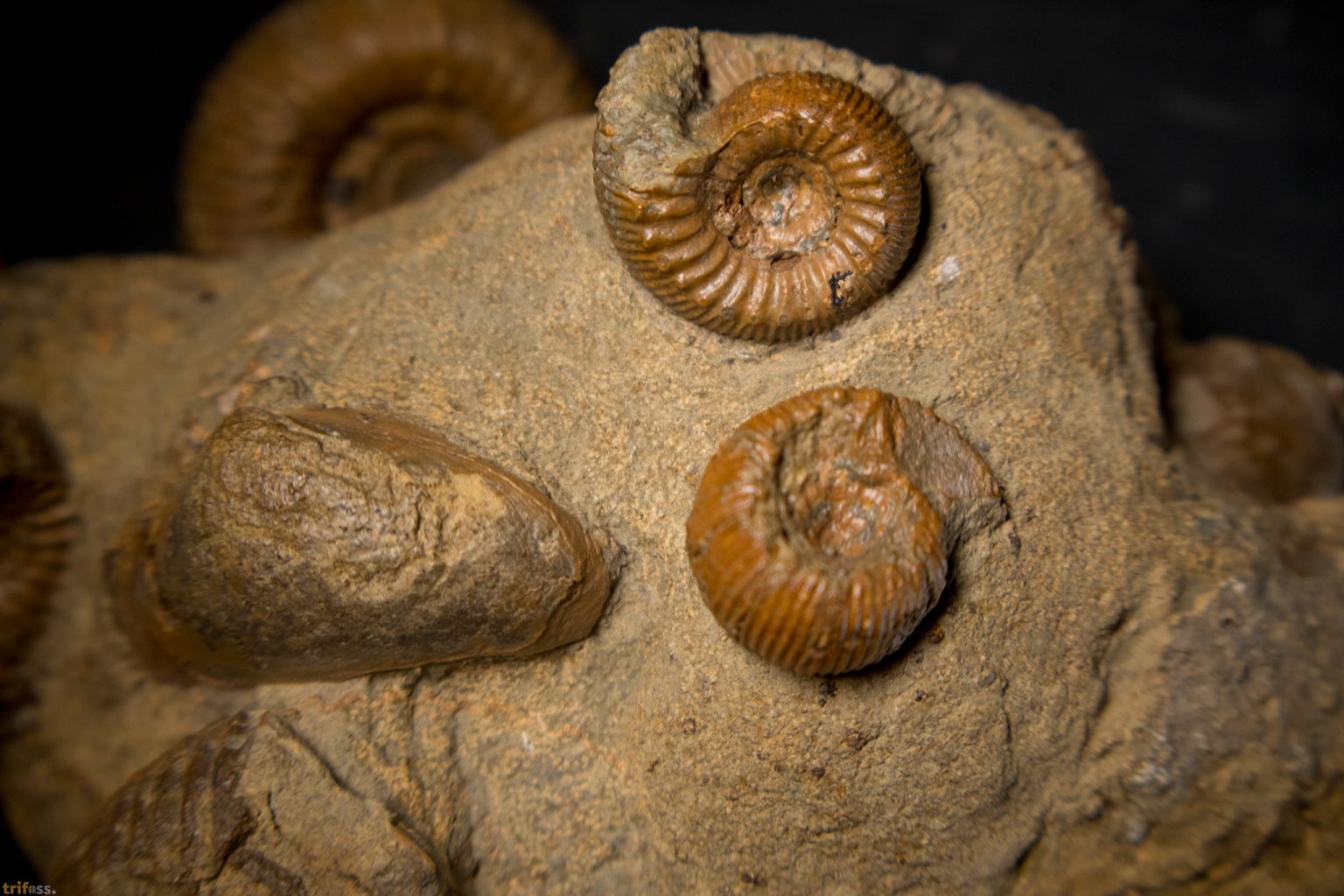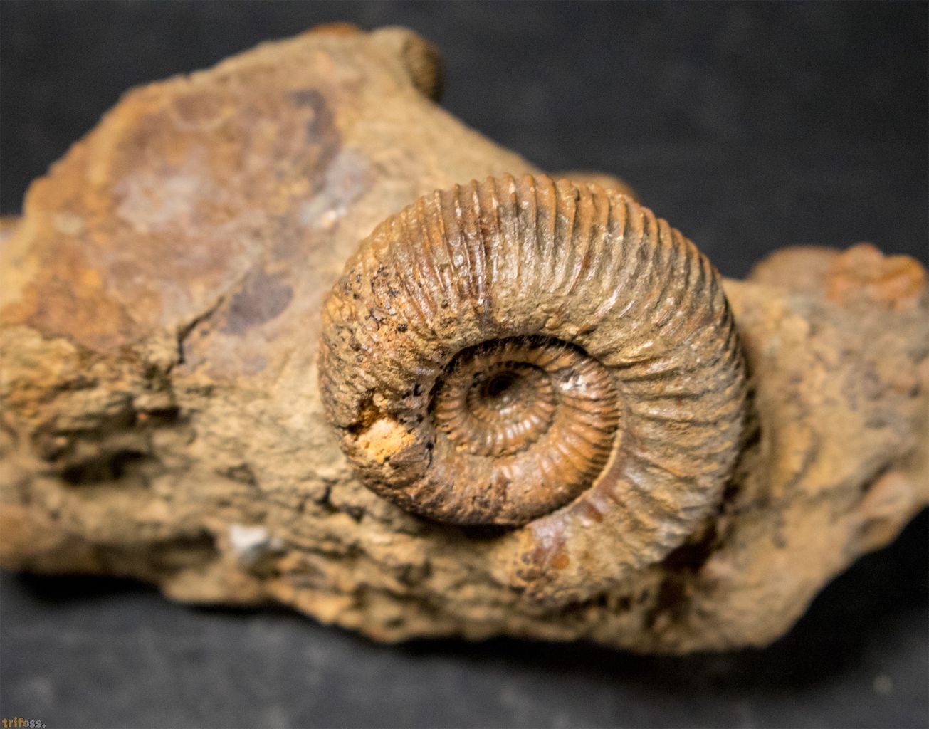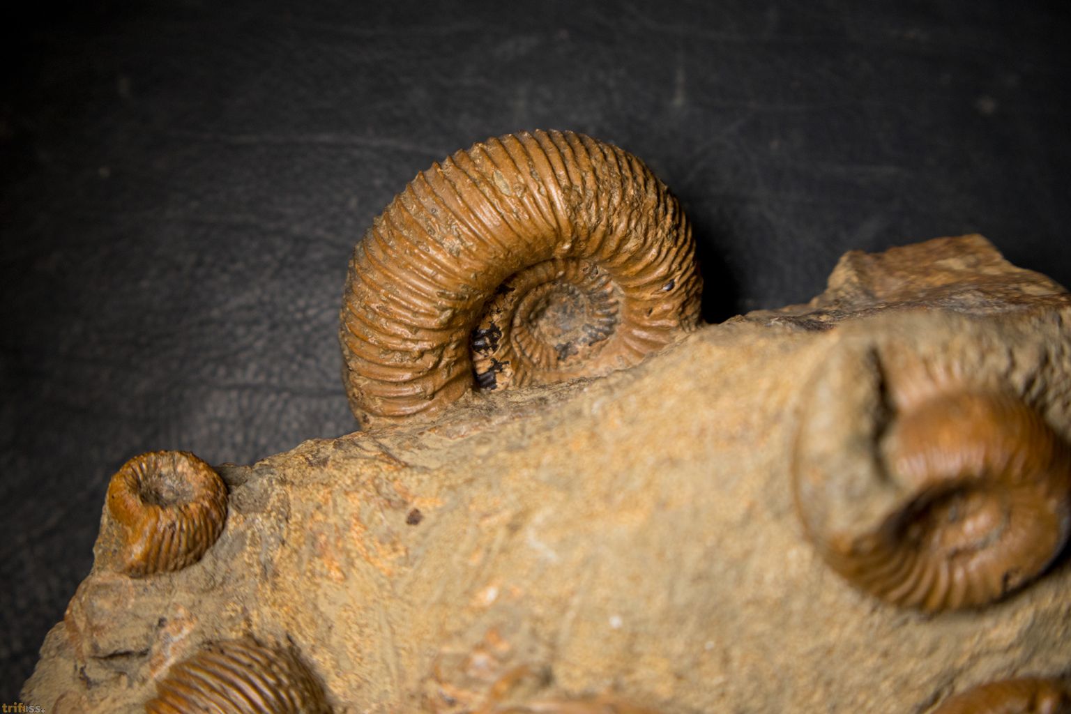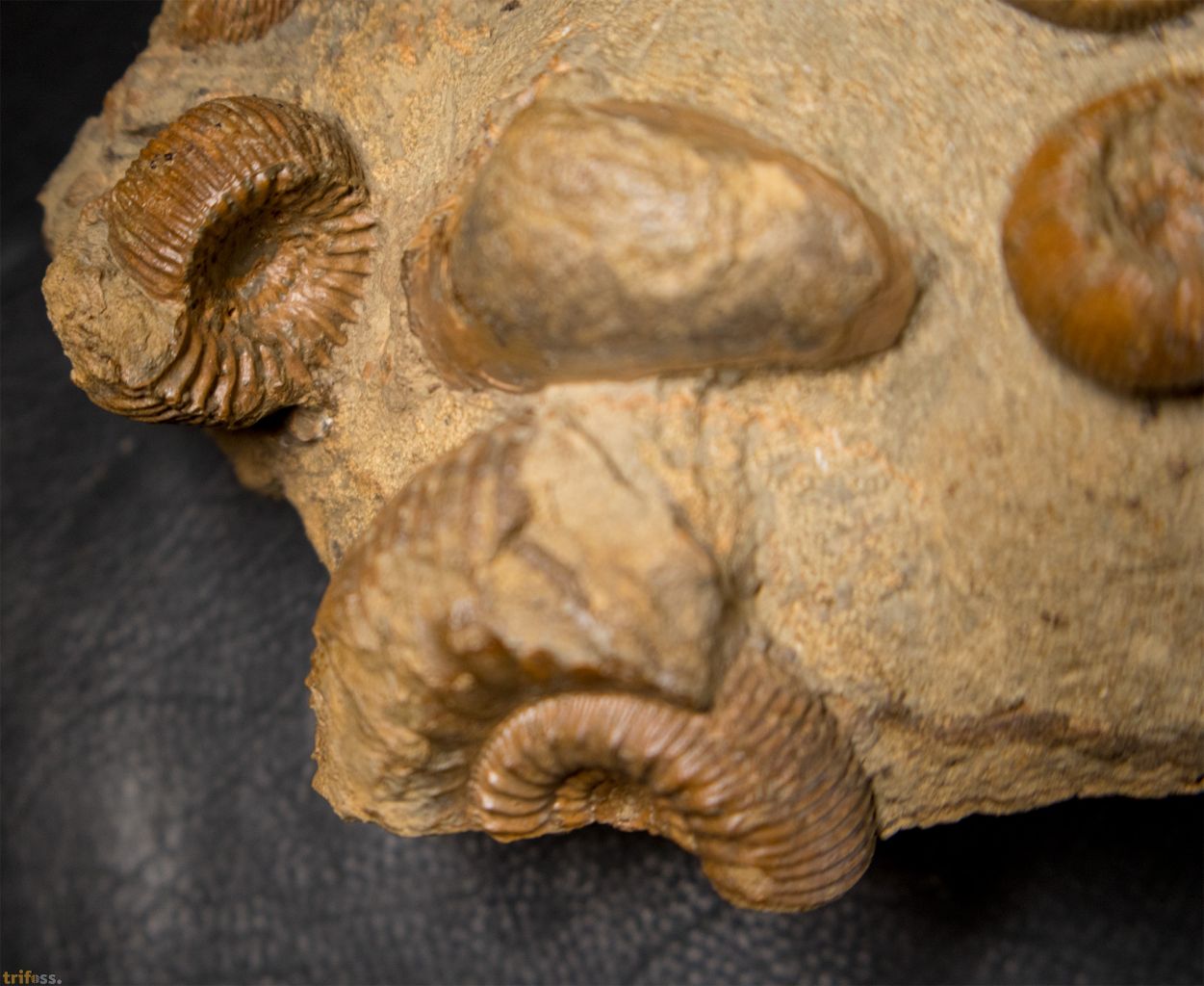 Hier ist eine dekorative Ammoniten-Stufe aus dem Jura der Schweiz mit mehreren Exemplaren der Art Stephanoceras humphriesianum. Der größte Ammonit auf diesem Stück misst etwa 56 mm.