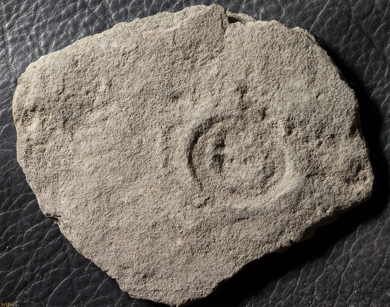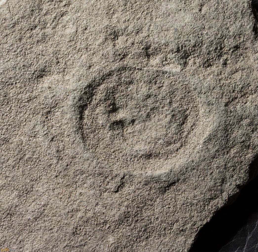 Hier ist ein Ediacara - Fossil der Art Cyclomedusa dniestriensis aus dem Präkambrium der westlichen Ukraine. Die Cyclomedusa selber misst etwa 34 mm.