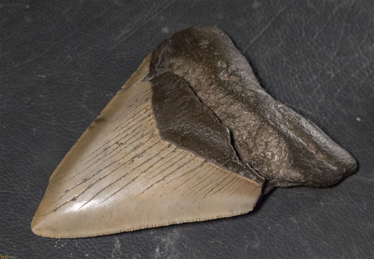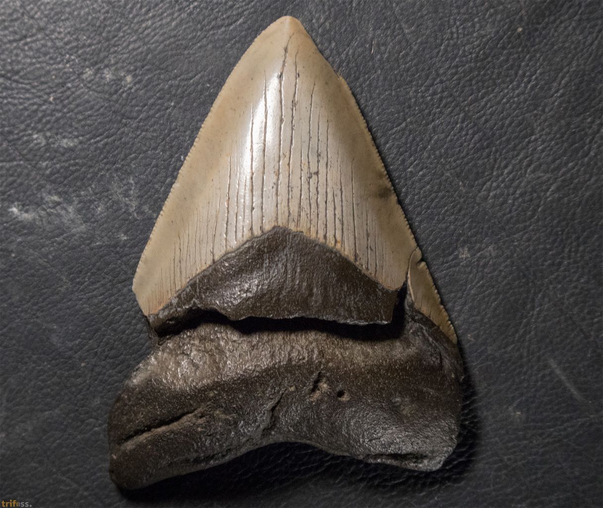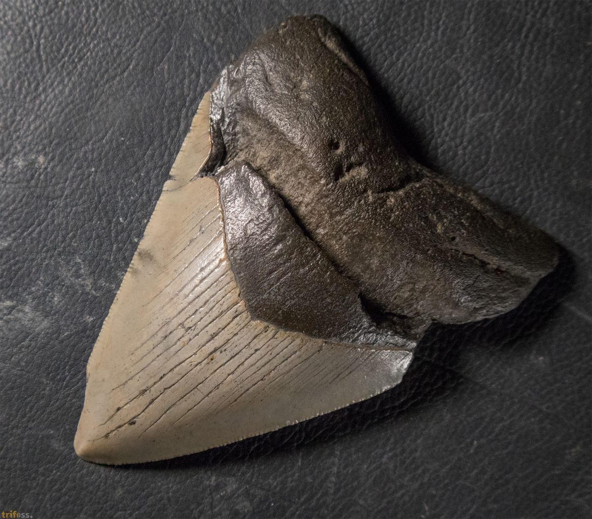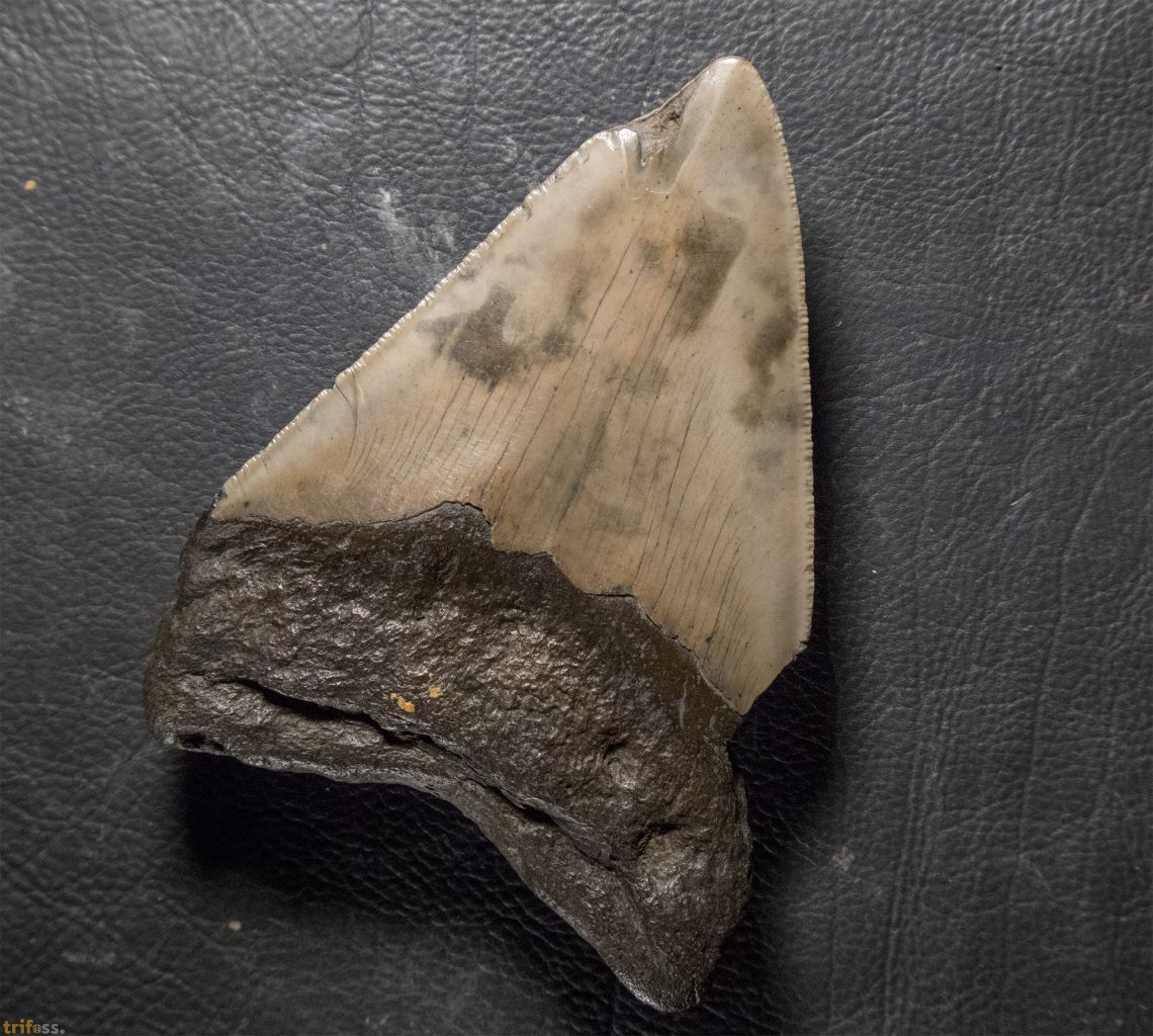 Dieser Megalodon Zahn ist etwa 116 mm groß. Er misst damit ungefähr 4,5 Zoll.