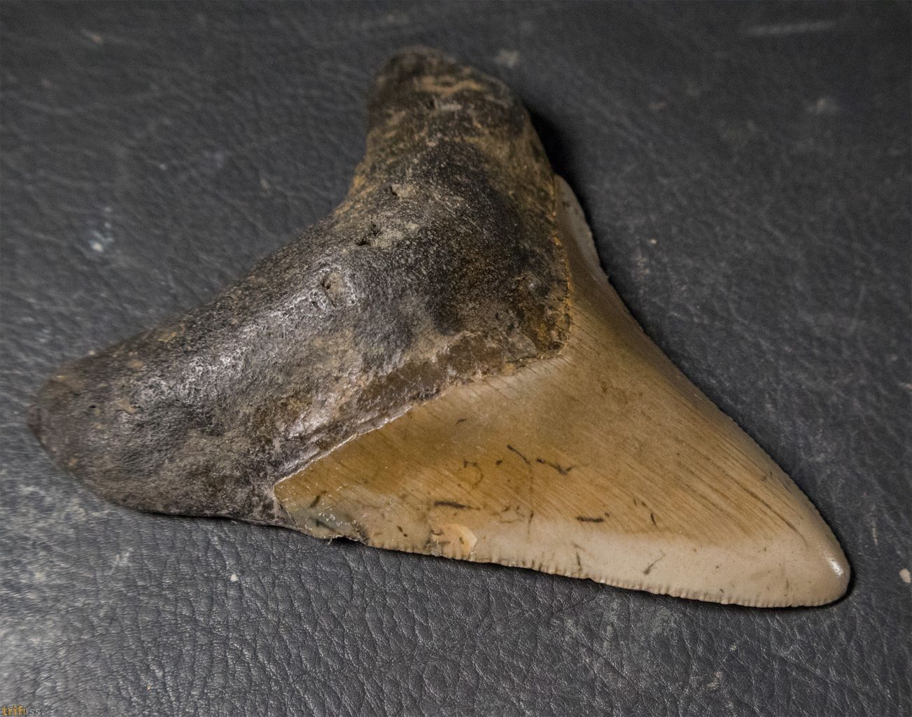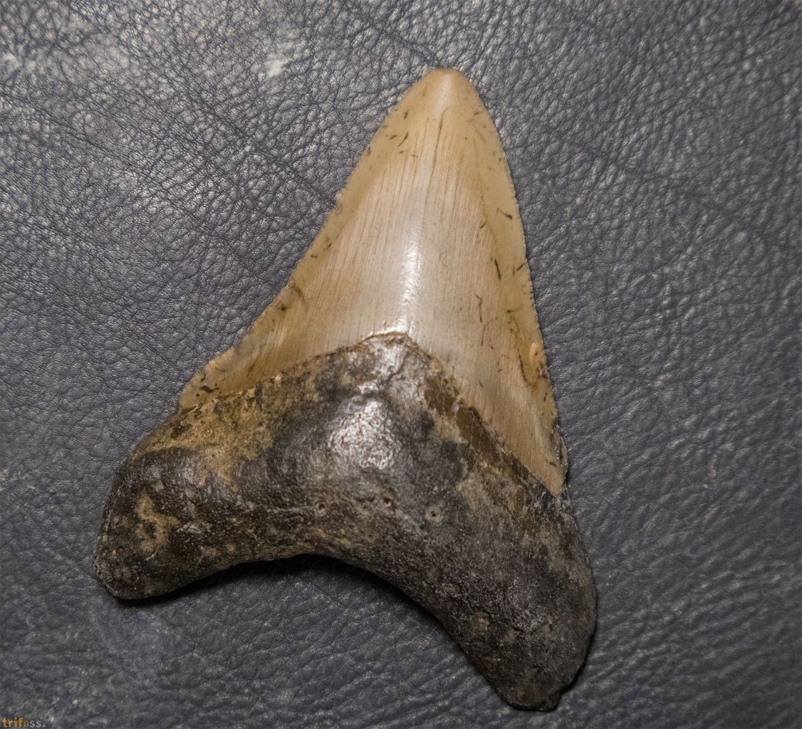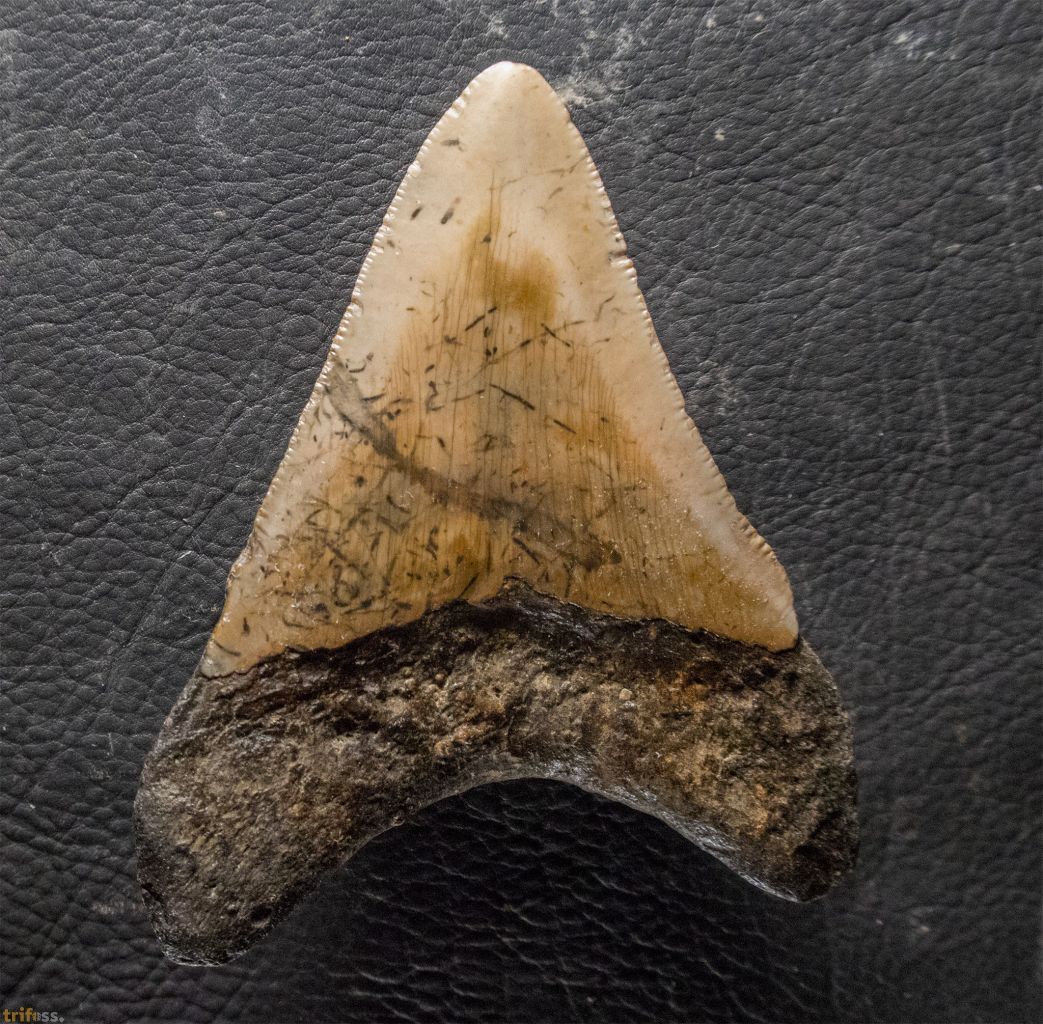 Hier ist ein sehr schöner Megalodon Zahn mit einer Größe von ca. 87 mm, also grob 3.5 Zoll.