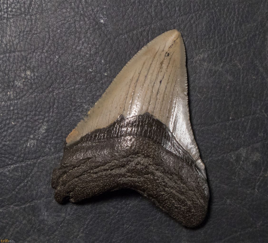Dies ist ein detailreicher Megalodon Zahn mit einer Größe von ca 75 mm, also etwa 3 Zoll.