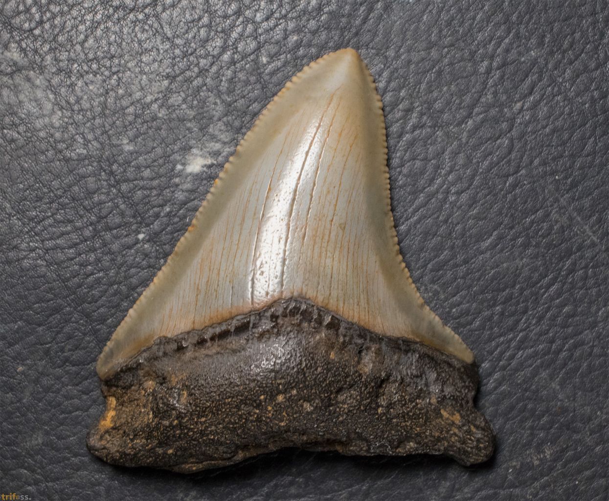 Hier ist ein detailreicher Megalodon Zahn mit einer Größe von ca 60 mm, also etwa 2.5 Zoll.