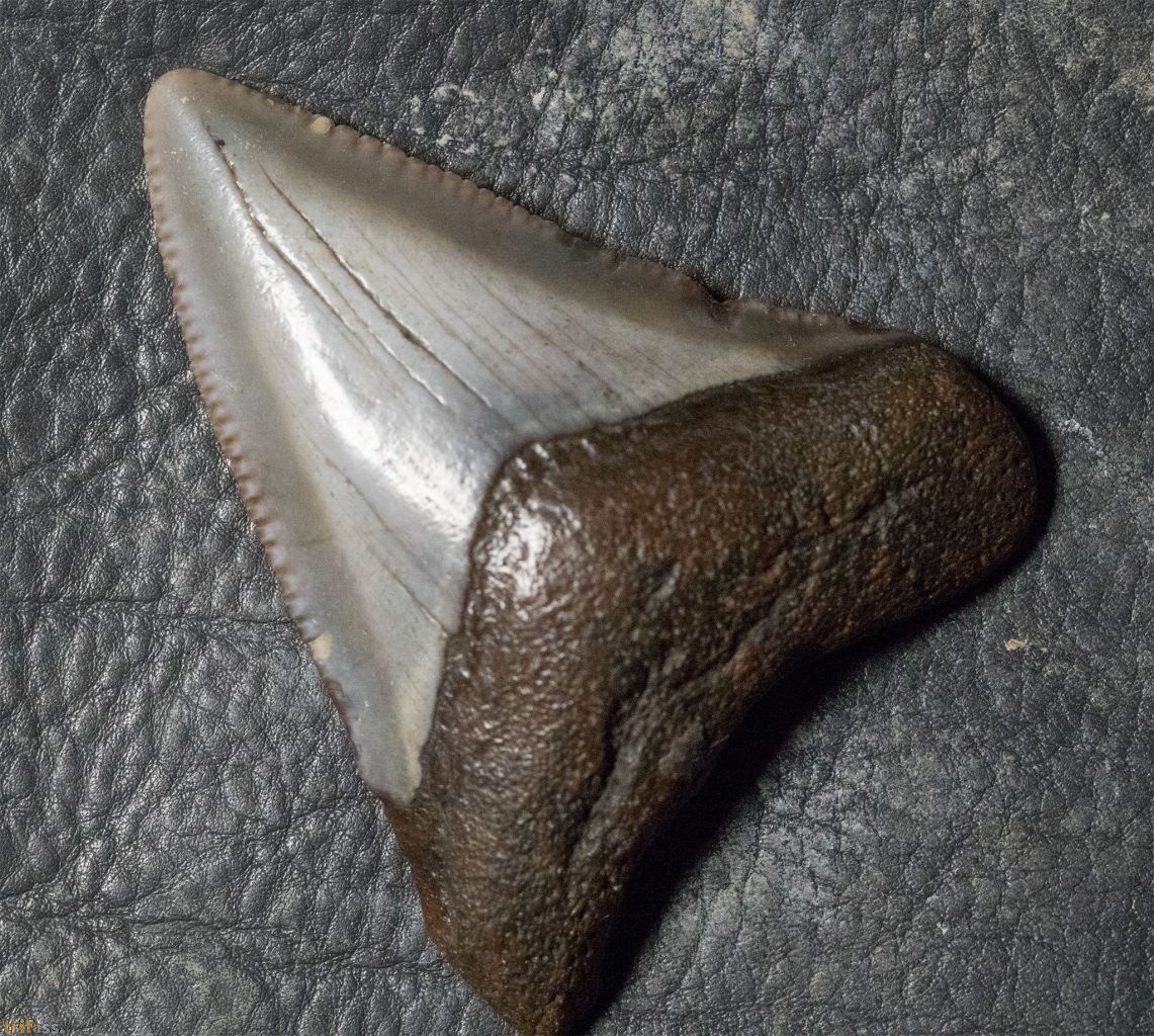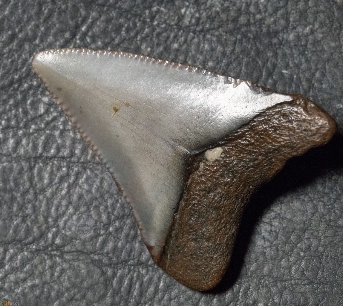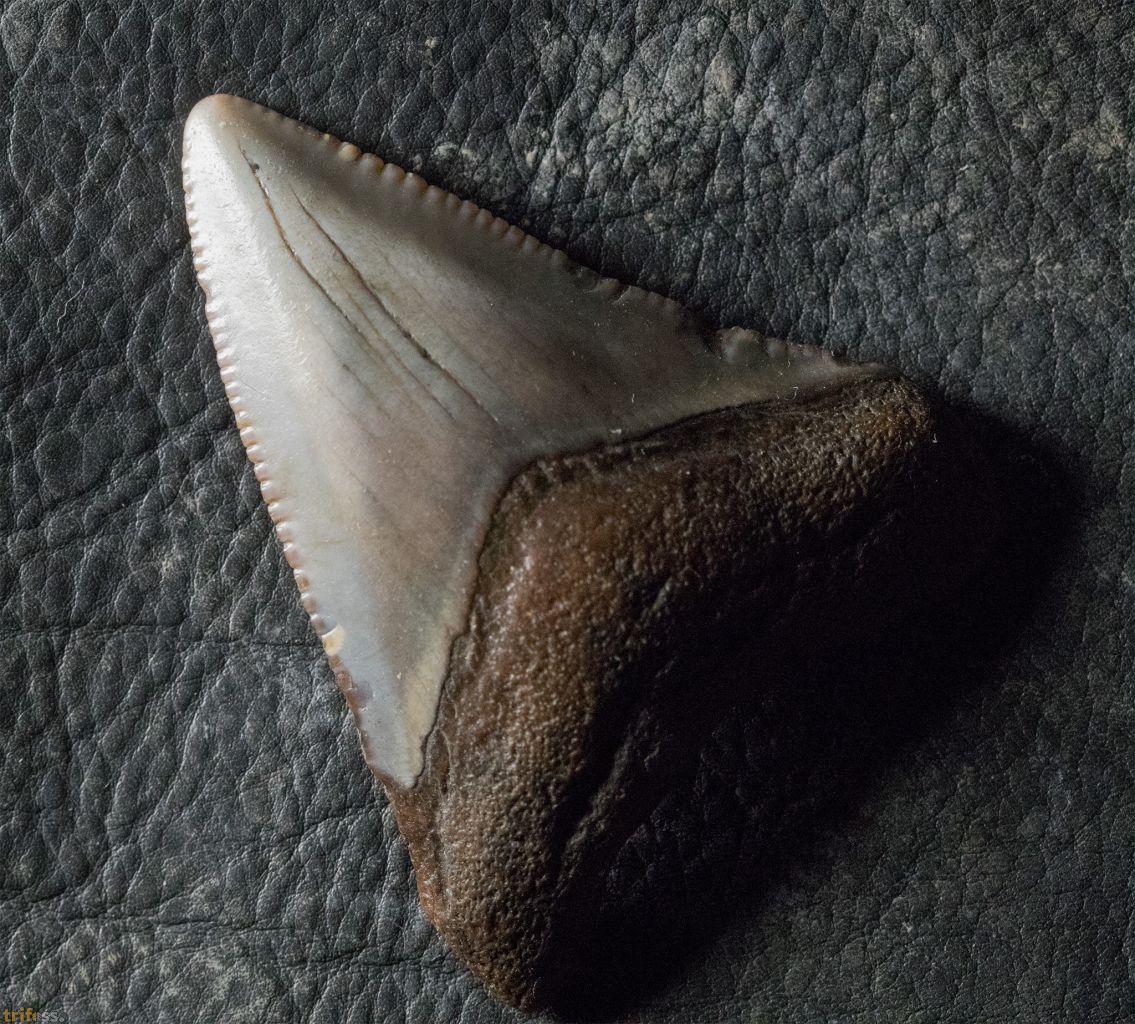 Hier ist ein kleiner und detailreicher Megalodon-Zahn mit einer Länge von etwa 49 mm.