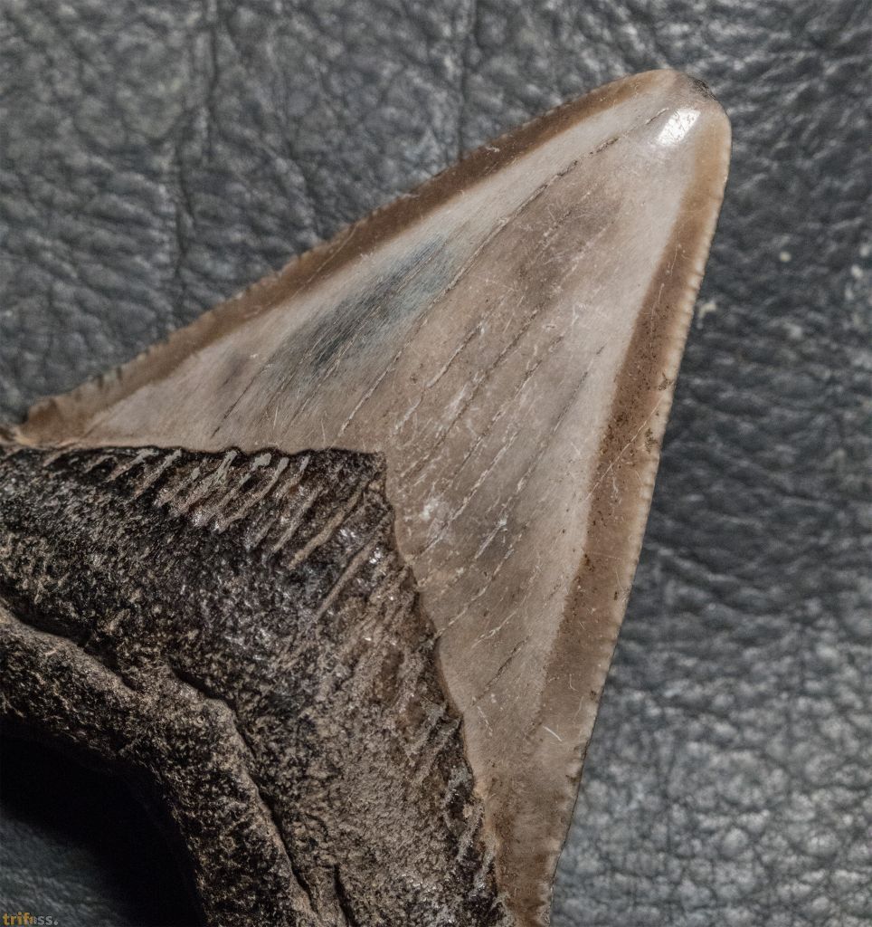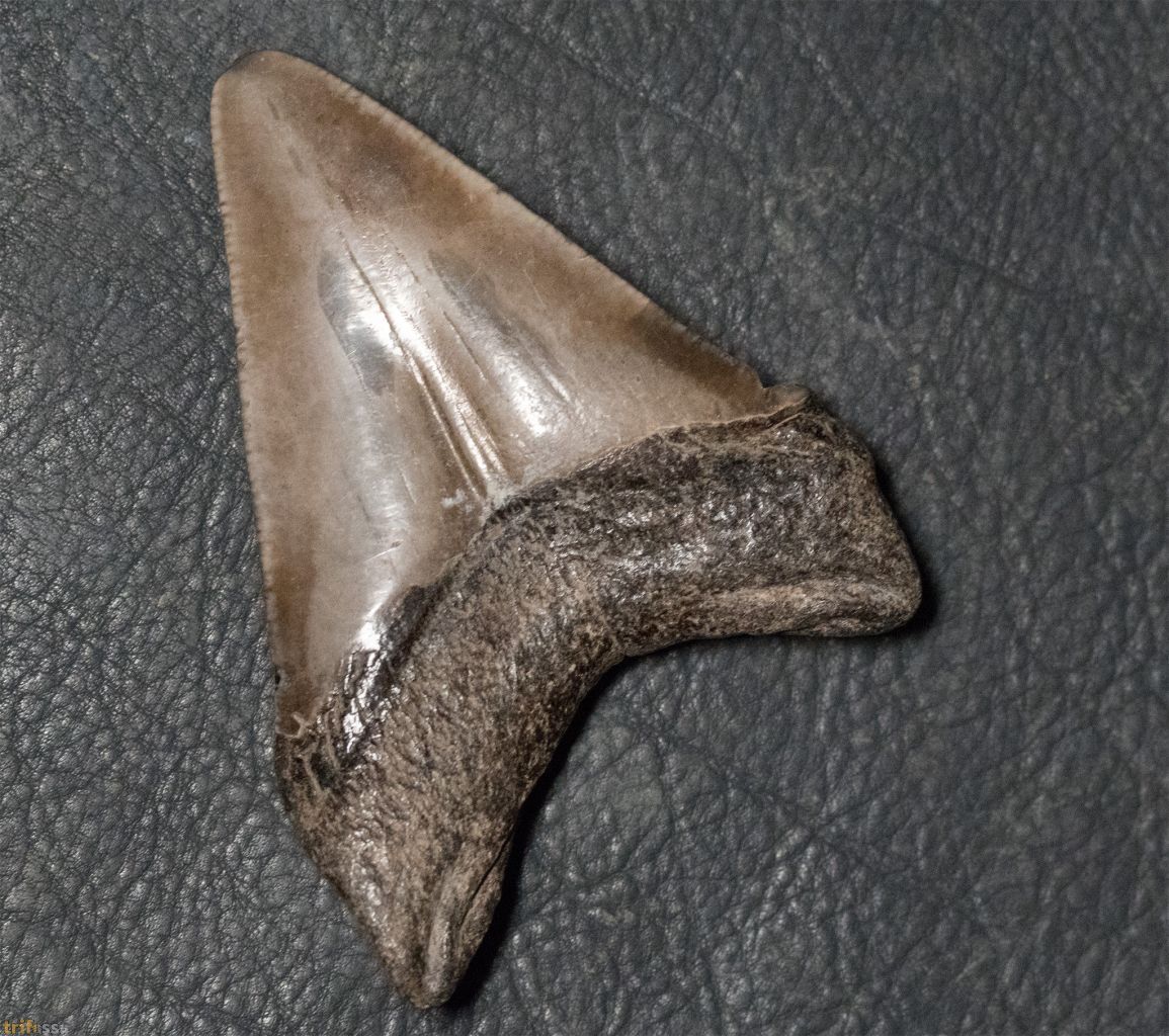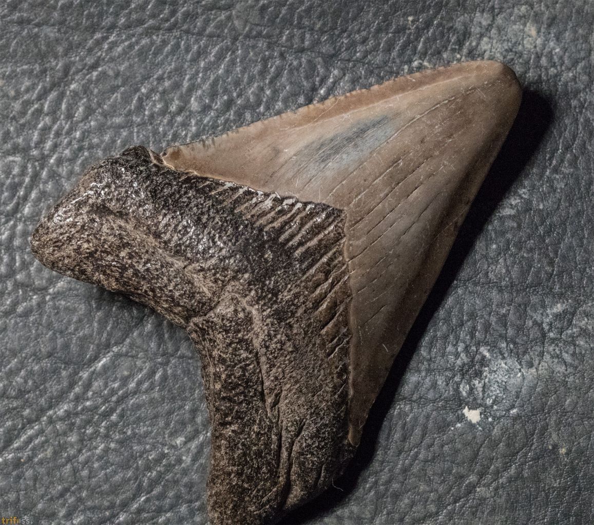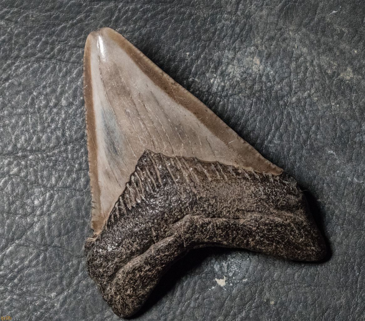 Hier ist ein Megalodon Zahn mit einer Länge von etwa 65 mm, also ungefähr 2.5 Zoll.