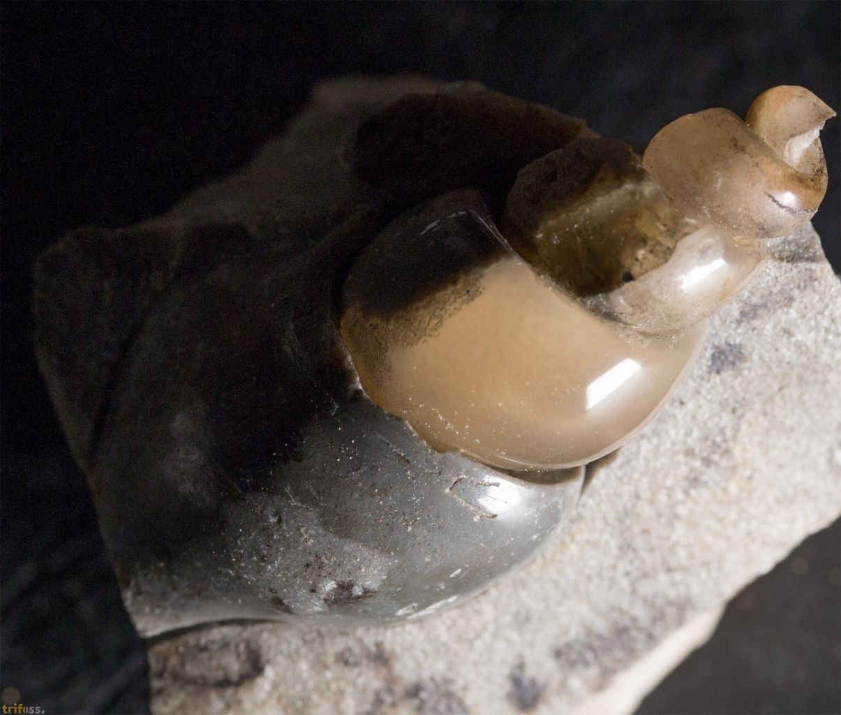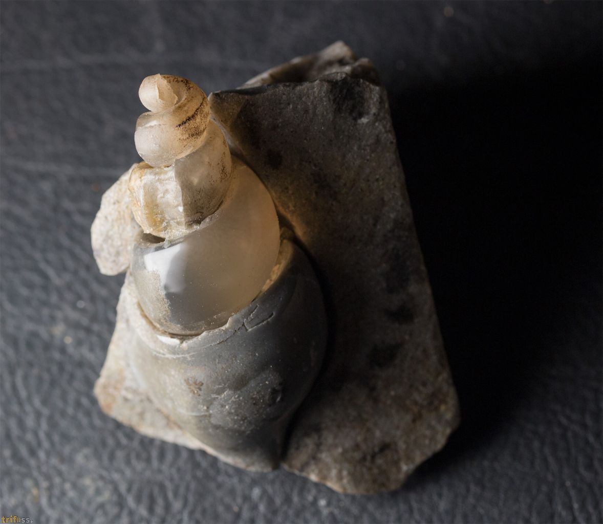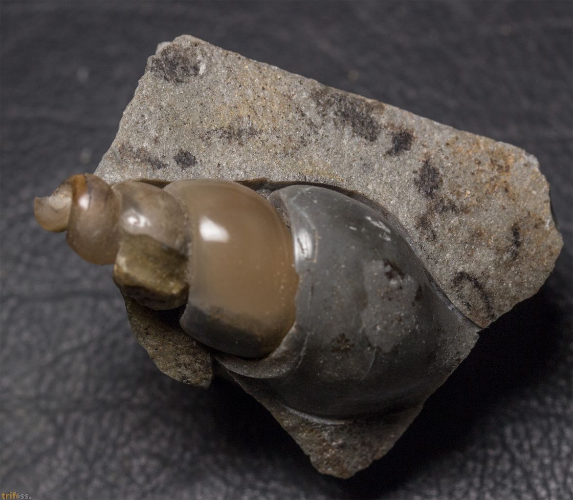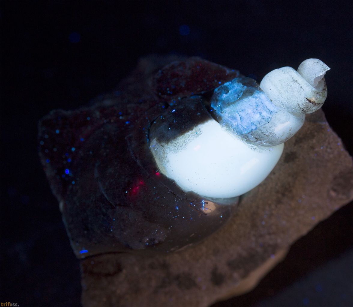 Eine Besonderheit dieser Fundstelle ist die Erhaltung der Schnecken als Chalcedon - Pseudomorphosen, bei denen die ursprünglichen Steinkerne überwiegend durch Chalcedon ersetzt wurden. Der Chalcedon zeigt zudem eine starke Lumineszenz unter UV Licht, was die Stücke besonders attraktiv macht. Es ist eine tatsächlich ungewöhnliche und besonders dekorative Erhaltungsform.