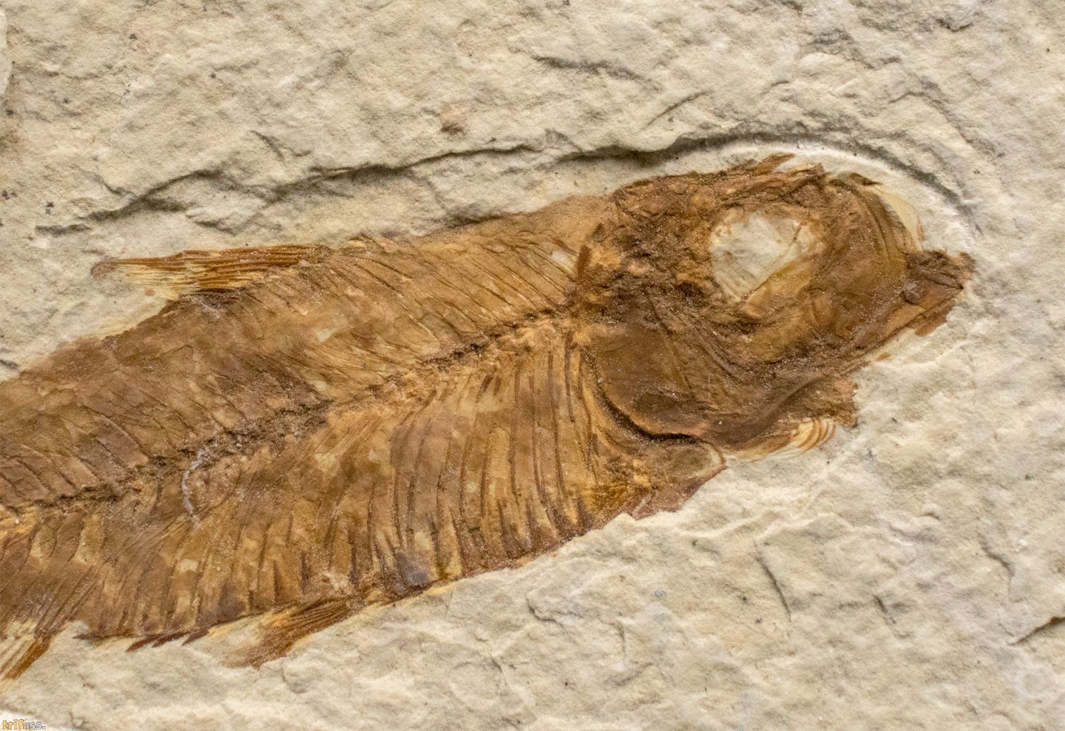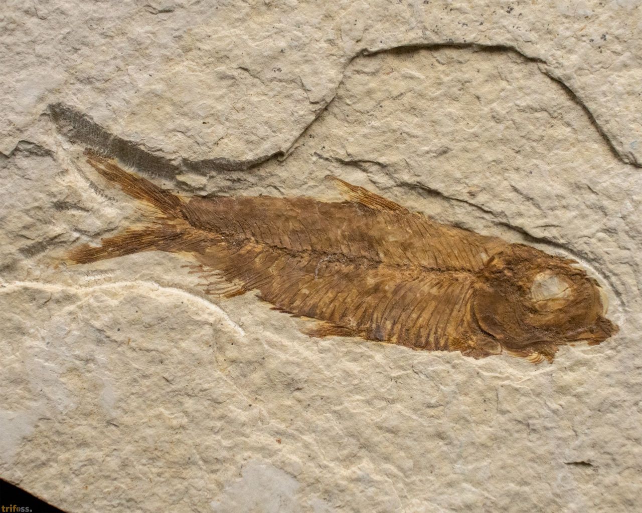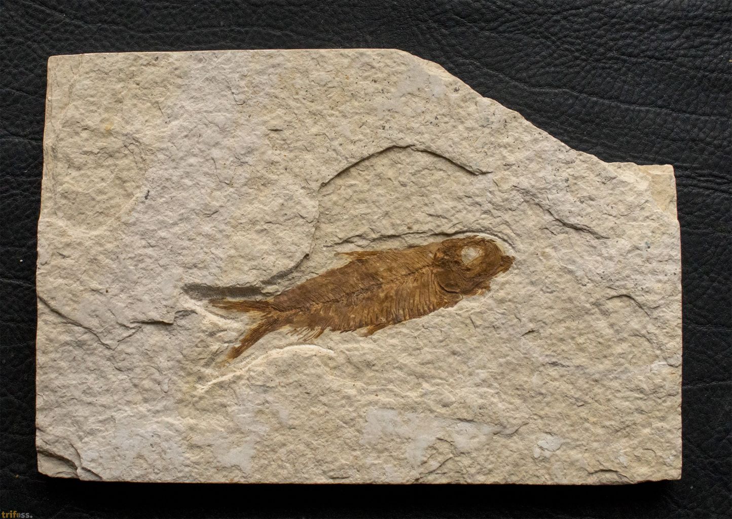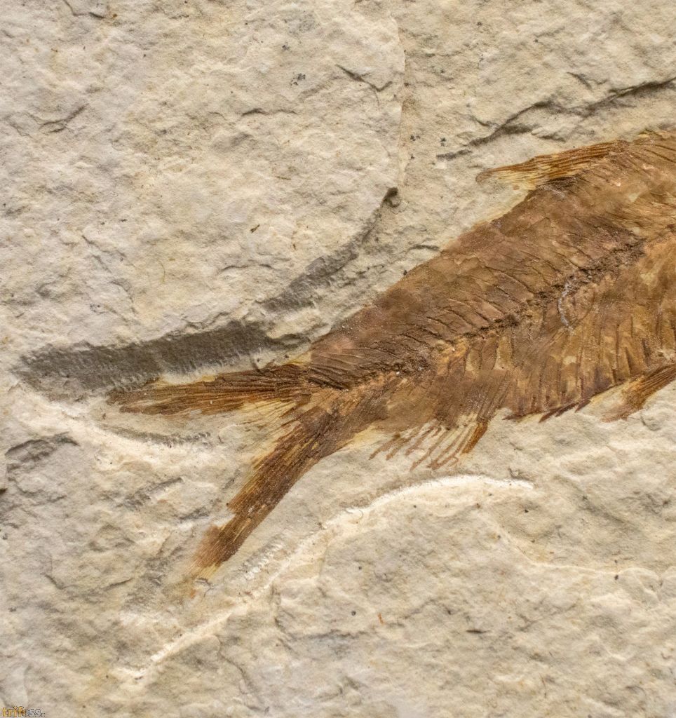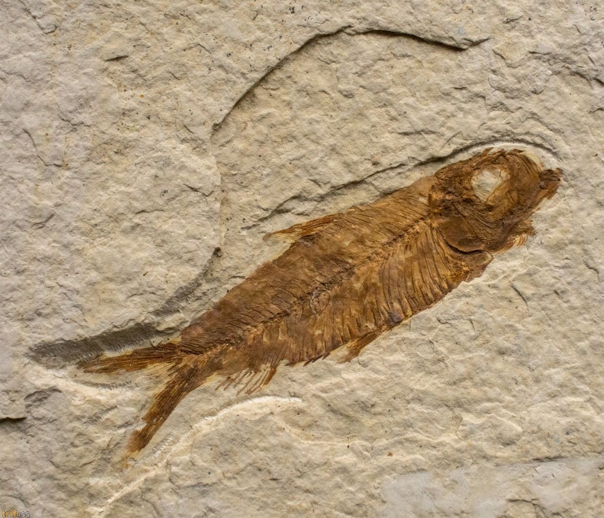 Hier ist ein fossiler Fisch der Art Knightia eocaena aus der Green - River - Formation.Der fossile Fisch ist etwa 62 mm Lang.Dieses Exemplar ist ein sogenannter „Split Fish“.. Fossilien aus diesen Schichten lassen sich meist durch einfaches Spalten der Gesteinsplatten freilegen. Dabei geht jedoch häufig ein kleiner Teil der Fossilsubstanz verloren. Aus diesem Grund weisen viele Fossilien aus Wyoming kleine restaurierte oder kolorierte Bereiche auf. Oft betrifft dies nur einzelne Flossenstrahlen, gelegentlich aber auch andere Partien. Die Koloration erfolgt in der Regel sehr dezent und dient dazu, das Erscheinungsbild zu verbessern. Tatsächlich sind vollständig unrestaurierte Fische aus der Green-River-Formation relativ selten.Bei diesem Fossil handelt es sich um ein typisches Exemplar aus den Split Layers der Green-River-Formation, bei dem leichte Kolorationen wahrscheinlich sind.