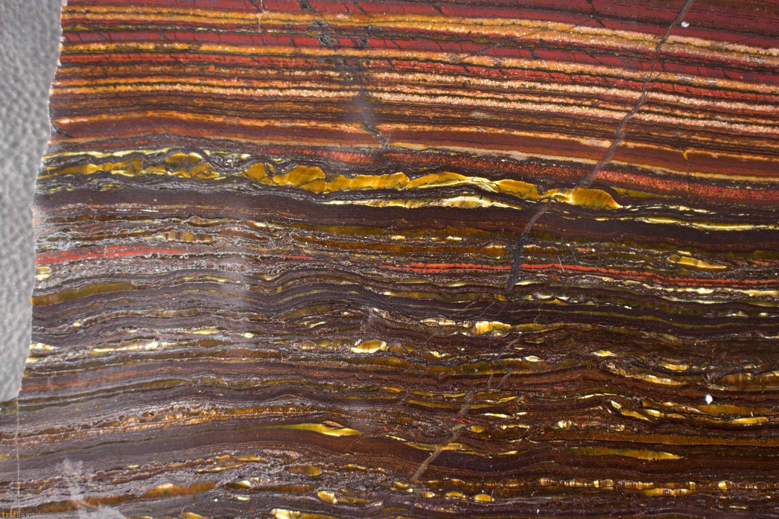Here we have a nice slice of banded iron from the Cleaverville Formation in the Pilbara region of Western Australia, dating back to the Archean-Proterozoic transition. This variety of banded iron formation (BIF) represents an ancient marine microbialite, formed during the Great Oxidation Event approximately 3 billion years ago, when iron precipitated from seawater due to rising oxygen levels. The polished section displays alternating layers of magnetite and golden-brown quartz bands often reminiscent of tiger’s eye. These quartz bands may reflect the transformation of earlier crocidolite (blue asbestos) minerals that later underwent metamorphism. The geological significance of BIFs lies in their role in Earth’s oxygenation: the rise of cyanobacteria and their oxygenic photosynthesis led to widespread iron deposition in the oceans, eventually enriching the atmosphere with oxygen. This oxygenation was crucial for the evolutionary development of complex life, including mammals including us humans. |