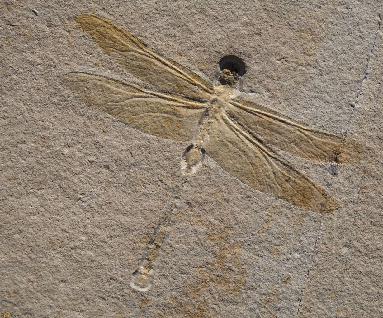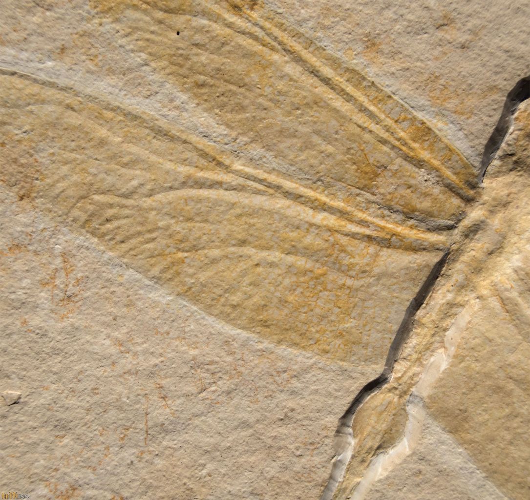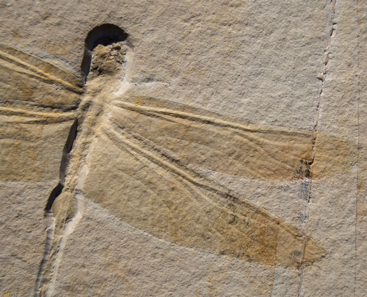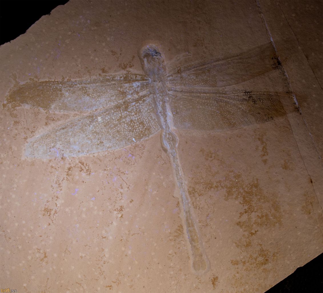 Bei dieser Solnhofen b- Libelle handelt es sich um ein besonders schönes und detailreiches Exemplar der Art Cymatophlebia longialata. Bemerkenswert ist, dass diese Libelle die Flügeläderung vollständig erhalten zeigt. Sie ist zum Teil sogar farbig erhalten. Besonders unter UV Licht tritt die Flügeläderung sehr deutlich hervor. Barlow et al. ist eine neuere Arbeit, die sich mit dem Nachweis organischer Substanz aus dem Plattenkalk mittels UV Licht beschäftigt. Die Arbeit erwähnt jedoch keine Insekten. Es handelt sich um einen interessanten Effekt, denn die UV Aufnahme sollte ursprünglich nur die Klebung und Restauration dieses Fossils besser sichtbar machen.