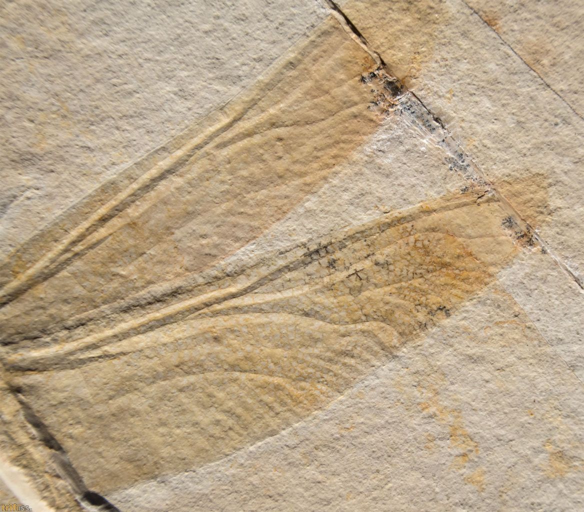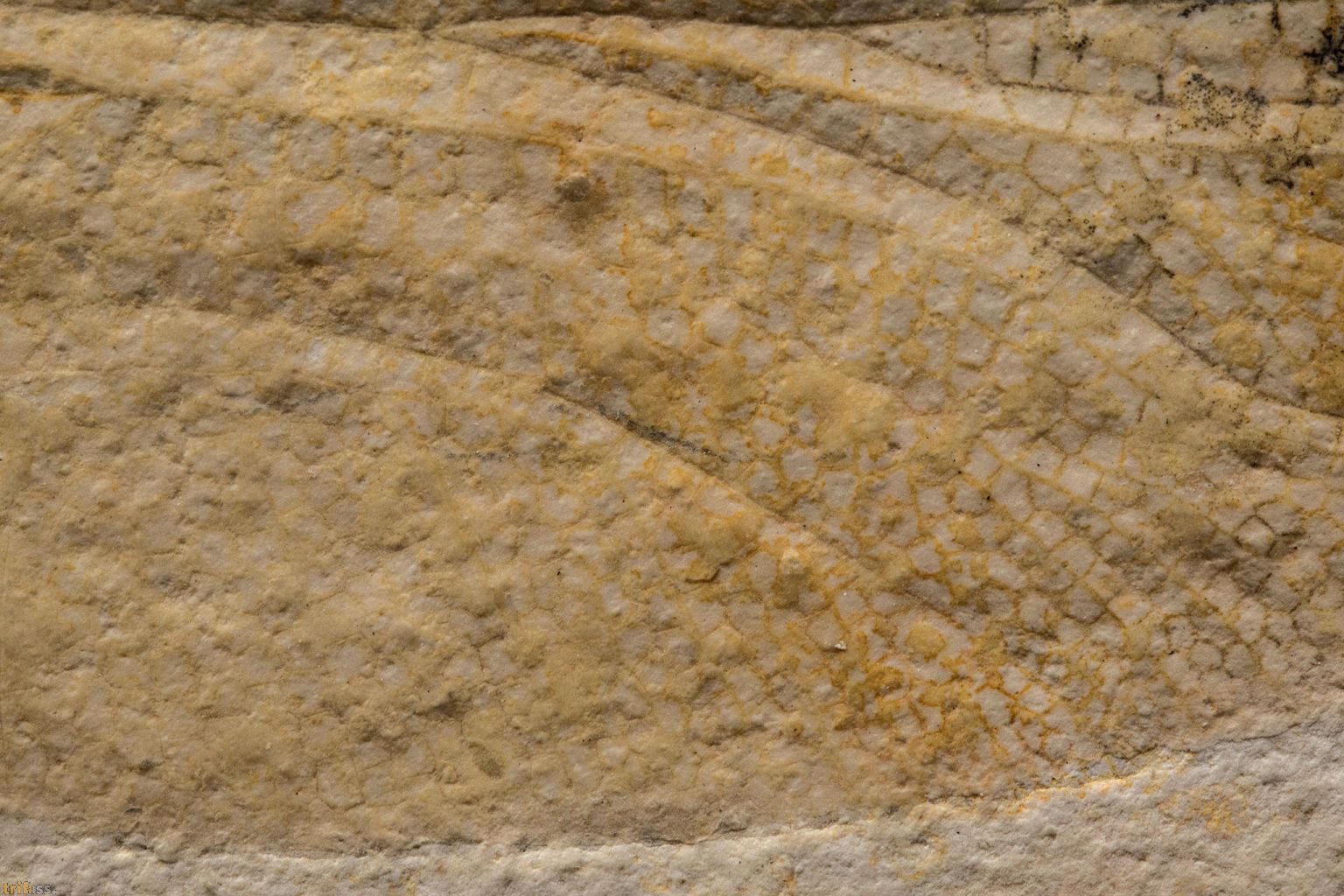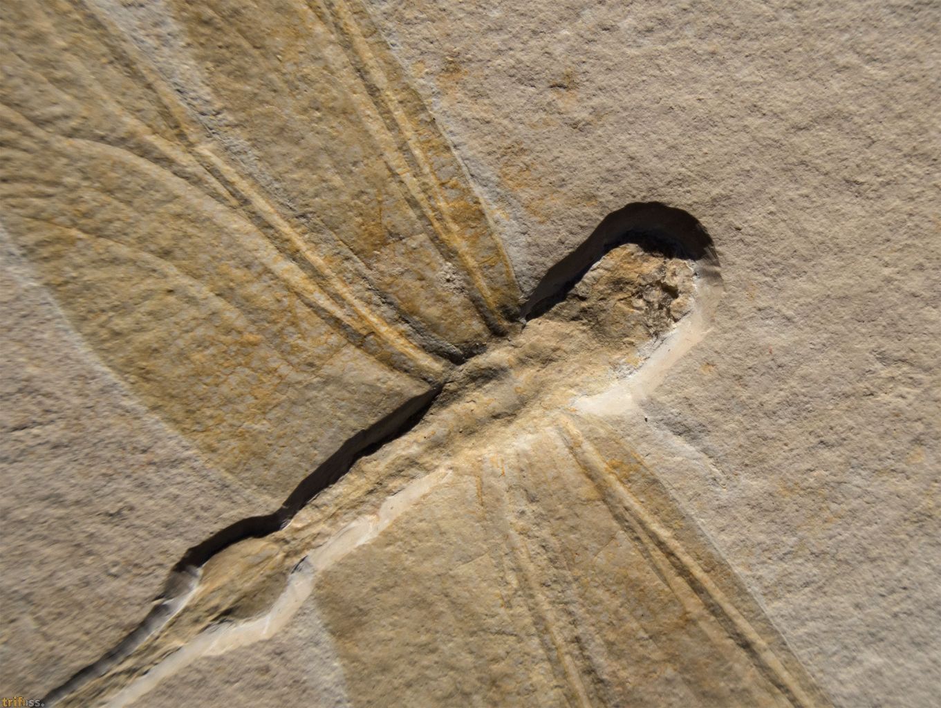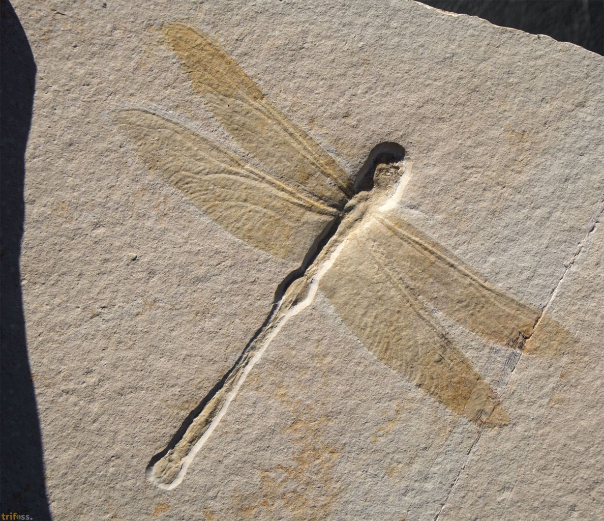 Bei dieser Solnhofen b- Libelle handelt es sich um ein besonders schönes und detailreiches Exemplar der Art Cymatophlebia longialata. Bemerkenswert ist, dass diese Libelle die Flügeläderung vollständig erhalten zeigt. Sie ist zum Teil sogar farbig erhalten. Besonders unter UV Licht tritt die Flügeläderung sehr deutlich hervor. Barlow et al. ist eine neuere Arbeit, die sich mit dem Nachweis organischer Substanz aus dem Plattenkalk mittels UV Licht beschäftigt. Die Arbeit erwähnt jedoch keine Insekten. Es handelt sich um einen interessanten Effekt, denn die UV Aufnahme sollte ursprünglich nur die Klebung und Restauration dieses Fossils besser sichtbar machen.