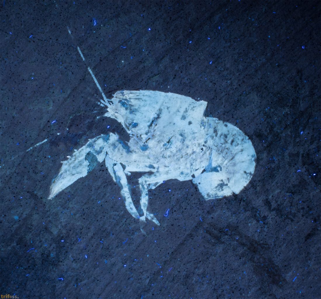 Hier ist ein fossiler Solnhofen - Krebs der Art Palaeastacus fuciformis aus der Lokalität Zandt.Insbesondere auf dem UV Bild zeigt das Exemplar einige sehr schöne Details.
