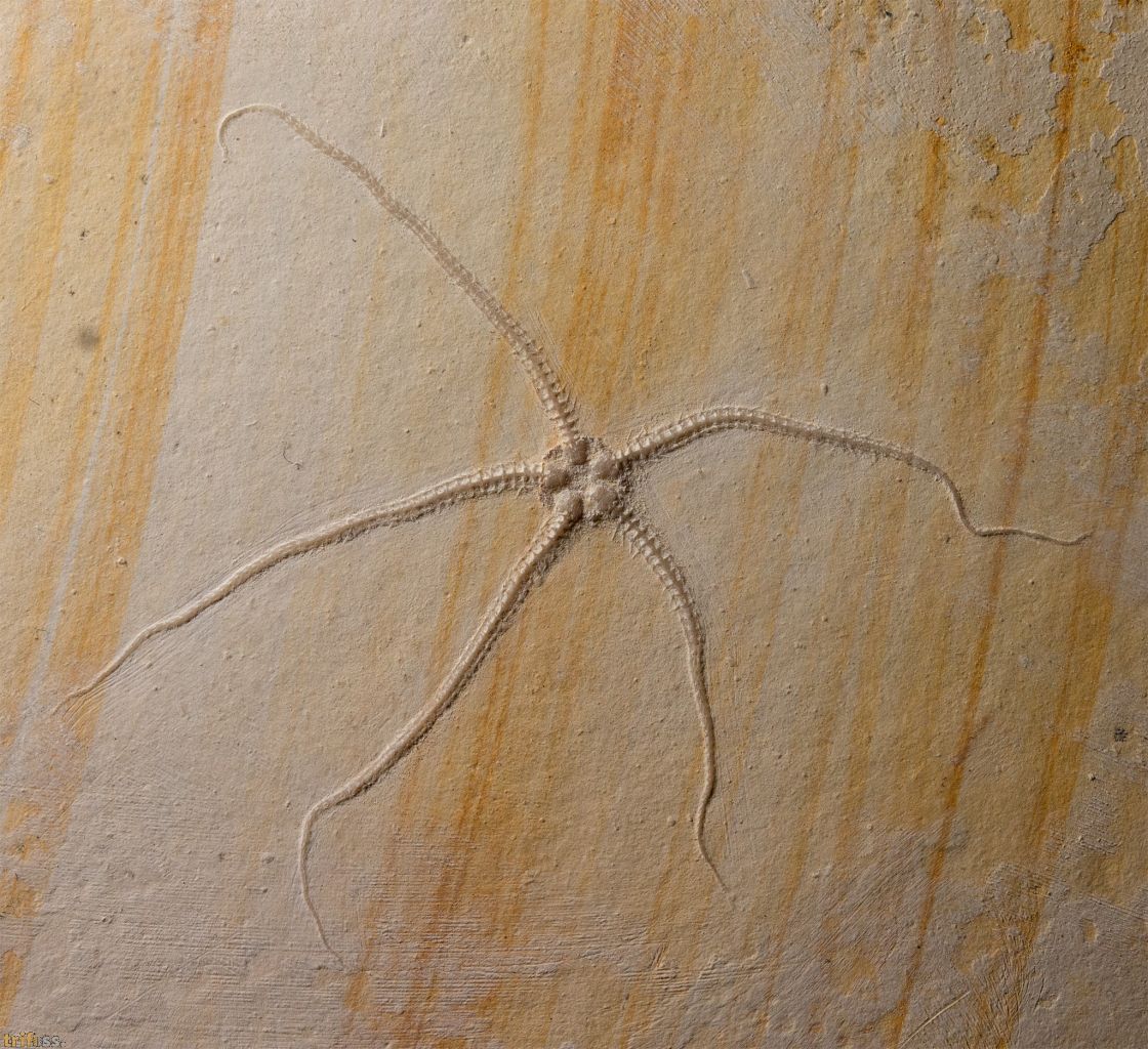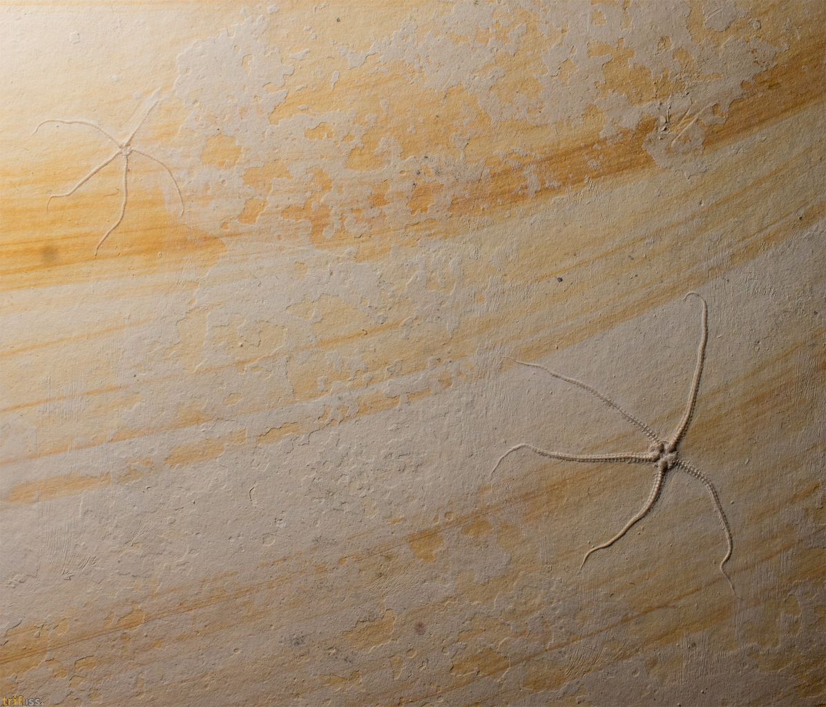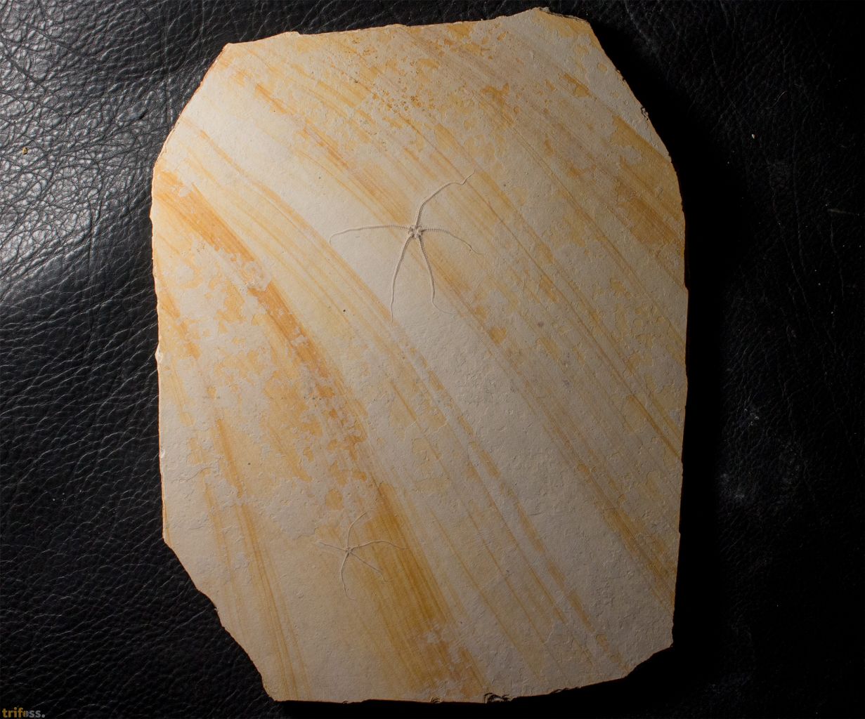 Dies ist ein besonders schönes Doppel-Exemplar des Schlangensterns Geocoma carinata aus den Plattenkalken von Zandt. Der größere Schlangenstern misst etwa 52 × 42 mm, gemessen in der eingebetteten Position auf der Platte. Dieses Geocoma-Doppel stellt ein seltenes und dekoratives Schaustück dar.