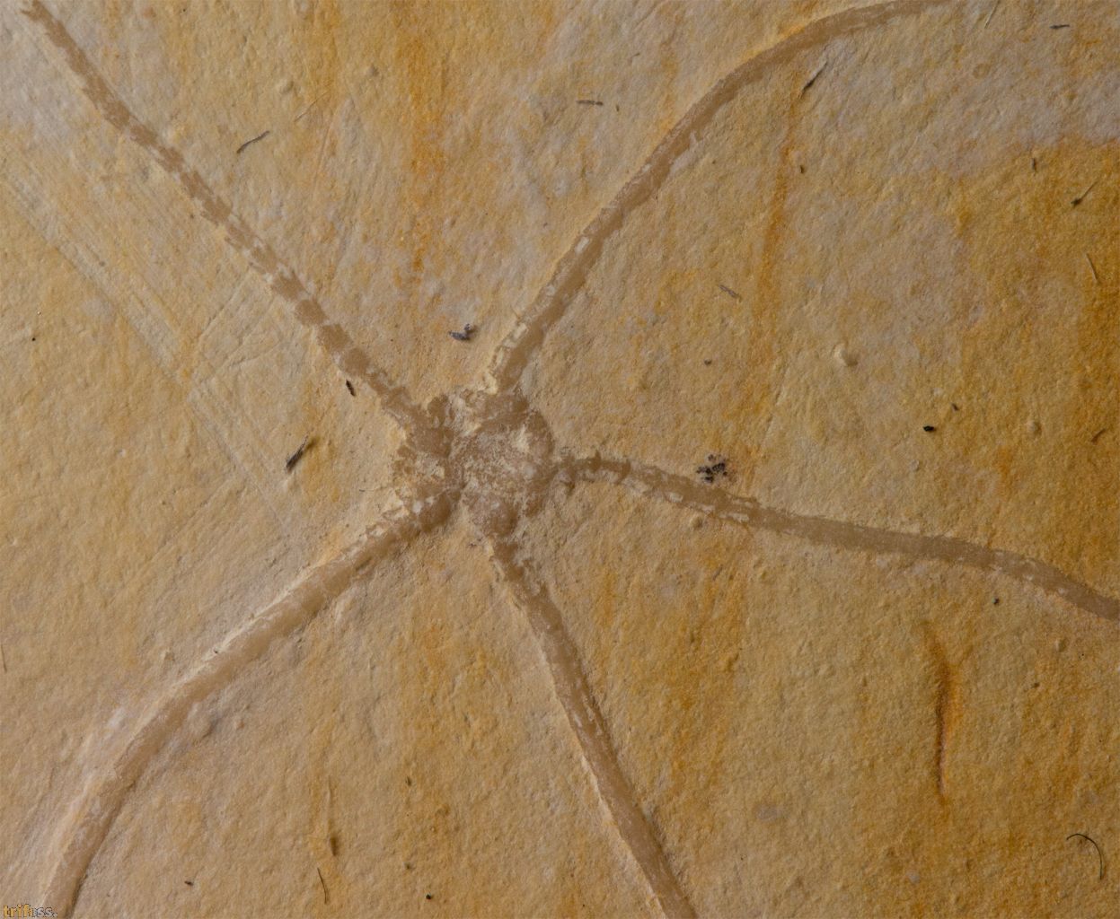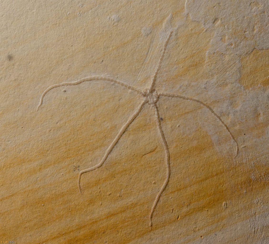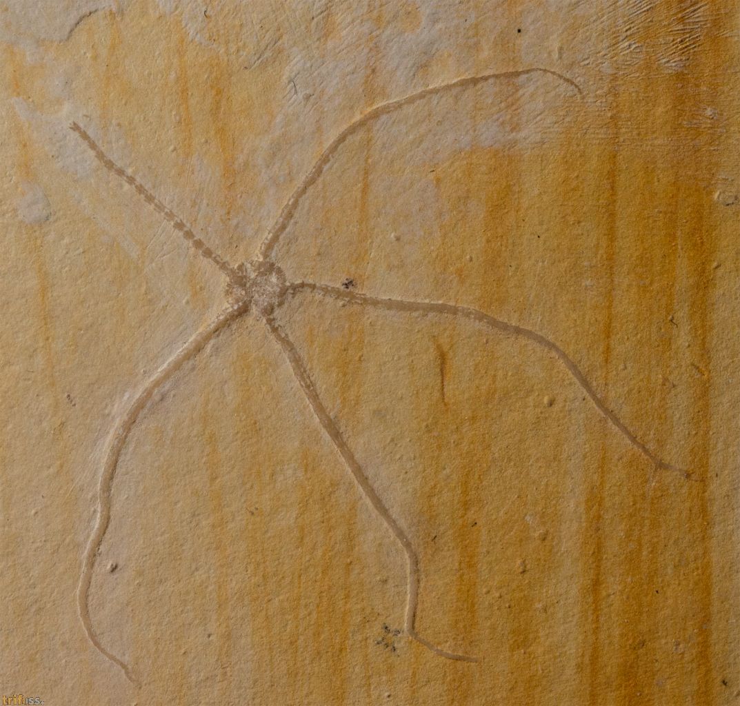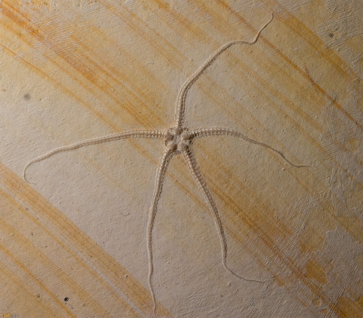 Dies ist ein besonders schönes Doppel-Exemplar des Schlangensterns Geocoma carinata aus den Plattenkalken von Zandt. Der größere Schlangenstern misst etwa 52 × 42 mm, gemessen in der eingebetteten Position auf der Platte. Dieses Geocoma-Doppel stellt ein seltenes und dekoratives Schaustück dar.