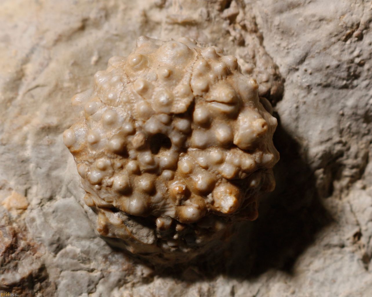 Hierbei handelt es sich um einen fossilen Seeigel der Art Acrocidaris nobilis als preiswertes Matrixstück. Der fossile Seeigel misst etwa 23 mm.