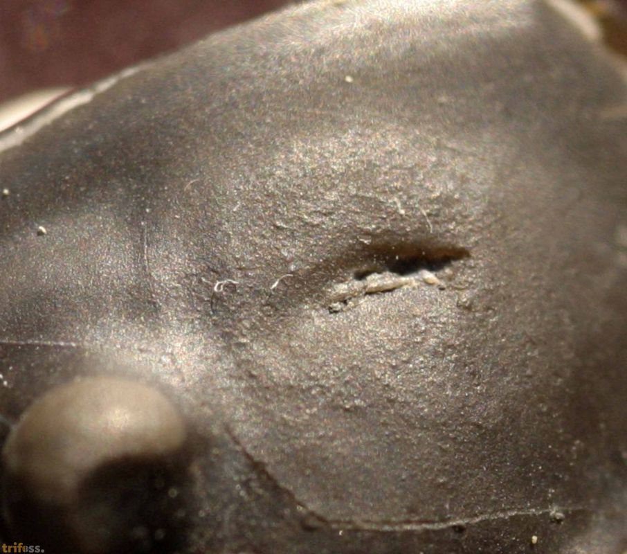 Dieser pathologische Isotellus weist auf der Glabella eine nicht verheilte Bisswunde auf. Eine weitere, fast verheilte Marke, lässt sich unterhalb des rechten Auges vermuten. Interessanterweise weist das Pygidium keine Verletzungen auf, so dass vermutet werden kann, dass dieses Exemplar in gestreckter Haltung von einem Jäger angegriffen wurde. Als Verursacher kommen im Ordovizium im Prinzip nur Nautiliden und Eurypteriden in Betracht. Bei ordovizischen Cephalopoden werden schnabelartige Mundwerkzeuge aus Chitin vermutet, welche für diese Art von Verletzung kaum in Frage kommen. Am wahrscheinlichsten scheint daher ein Eurypteride mit bedornter Schere als Täter in Frage zu kommen. | |||