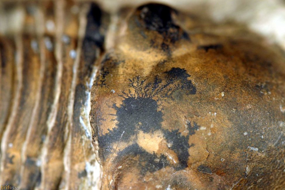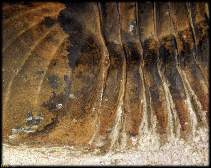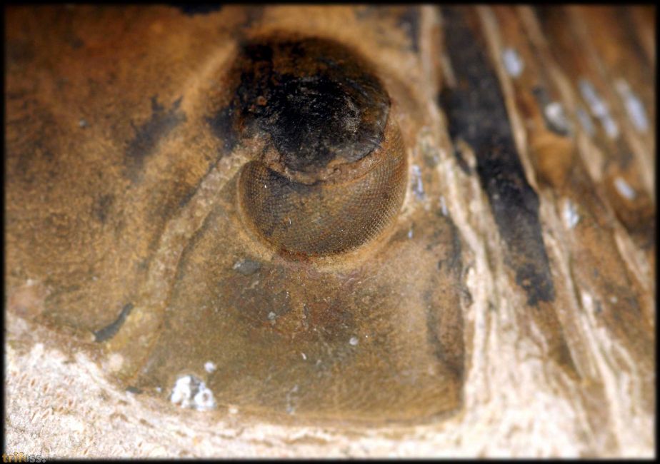 Ein Trilobiten mit viel Detail. Besonders ist die Schale zu beachten. Diese ist nämlich mit einer feinen Schicht aus Eisenmineralien überzogen, die ihr ein kontrastreiches Farbenspiel verleiht. Bei den aussergewöhnlichen Details fallen die erstklassigen Augen sowie die sehr feine Ornamentierung auf. | |||