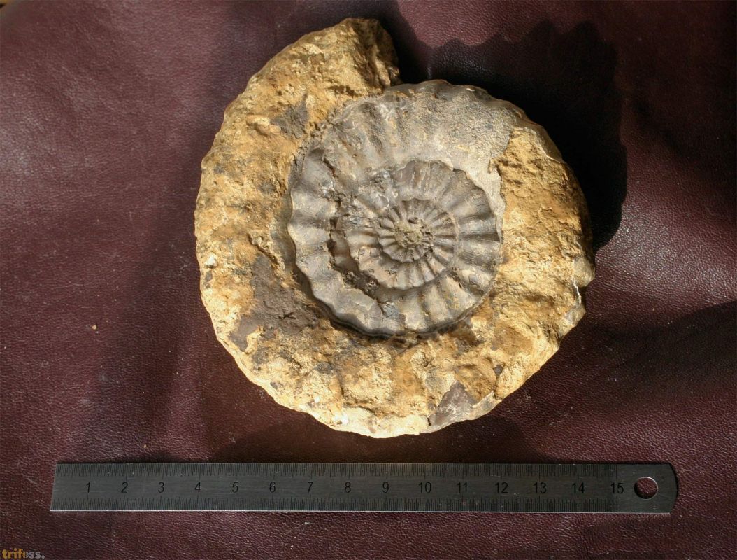 Dies ist ein sehr großer Androgynoceras capricornus aus dem Pliensbachium von Braunschweig. Das Stück entstammt einem temporären Aufschluss, der beim Autobahnbau bei Braunschweig bedingt zugänglich war. | |||||||