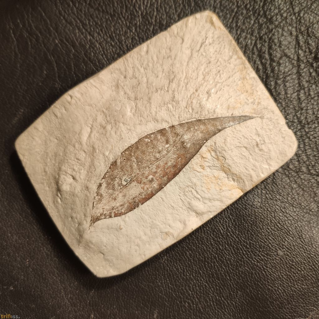 Hier ist ein schönes, fossiles Blatt vom Zimtbaum der Art Daphnogene polymorpha aus der oberen Süßwasser - Molasse von Pfaffenhofen. Das fossile Blatt selber ist etwa 73 mm lang. | |||