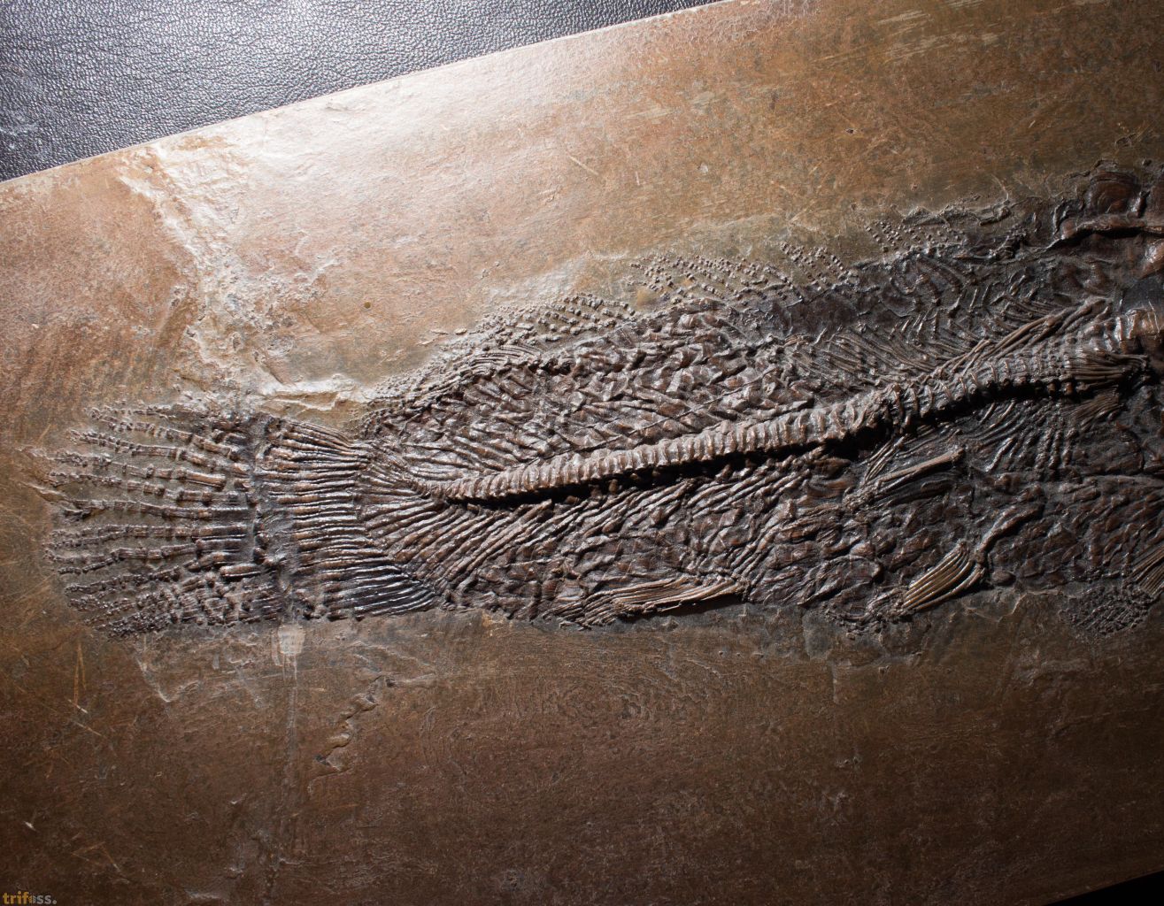 Dies ist ein großer, fossiler Messel - Fisch der Art Cyclurus kehreri mit ca 236 mm Länge. Diese Art ist auch als Messel - Schlammfisch, Kahlhecht oder unter dem Synonym Amia kehreri bekannt. Nur im Durchlicht ist eine Fehlstelle unter der Rückenflosse sichtbar, diese scheint auch seinerzeit leicht koloriert worden zu sein. Unter normalem Licht ist diese quasi unsichtbar. Dafür ist die lange Rückenflosse schön aufgestellt. Insgesamt ist dies ein schönes, großes und typisches Messelfossil. | |||