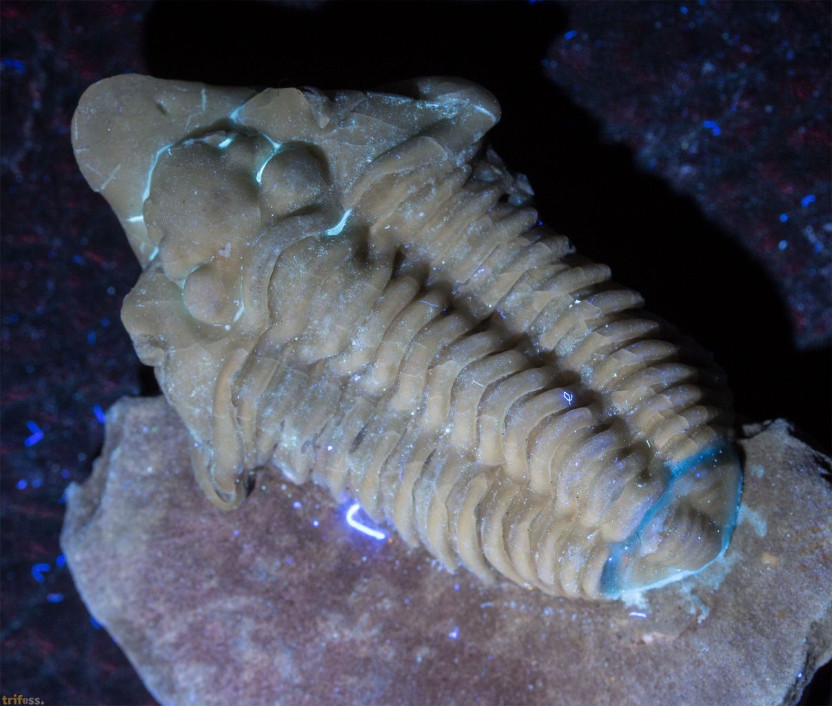 Bei diesem Trilobiten handelt es sich um eine seltene Spathacalymene nasuta aus dem Silur von Indiana. Die Gattung Spathacalymene zeichnet sich durch ein prägnantes , schaufelartiges Präglabellarfeld aus. Bei diesem Exemplar zeigt sich insbesondere unter UV Licht eine Auffälligkeit am Pygidium. Die Spots am Kopfschild sind unbedenklich, hier wurde im Zuge der Präparation die Schale stabilisiert. Jedoch am Schwanzschild sind die Klebungen auffällig. Es kann sein, dass hier lediglich die Schale aus dem Gegenstück übertragen wurde. Aber es ist hier vermutlich davon auszugehen, dass dasPygidium hier reartikuliert wurde. Es handelt sich hier trotzdem um ein dekoratives und spektakuläres Schaustück. | |||