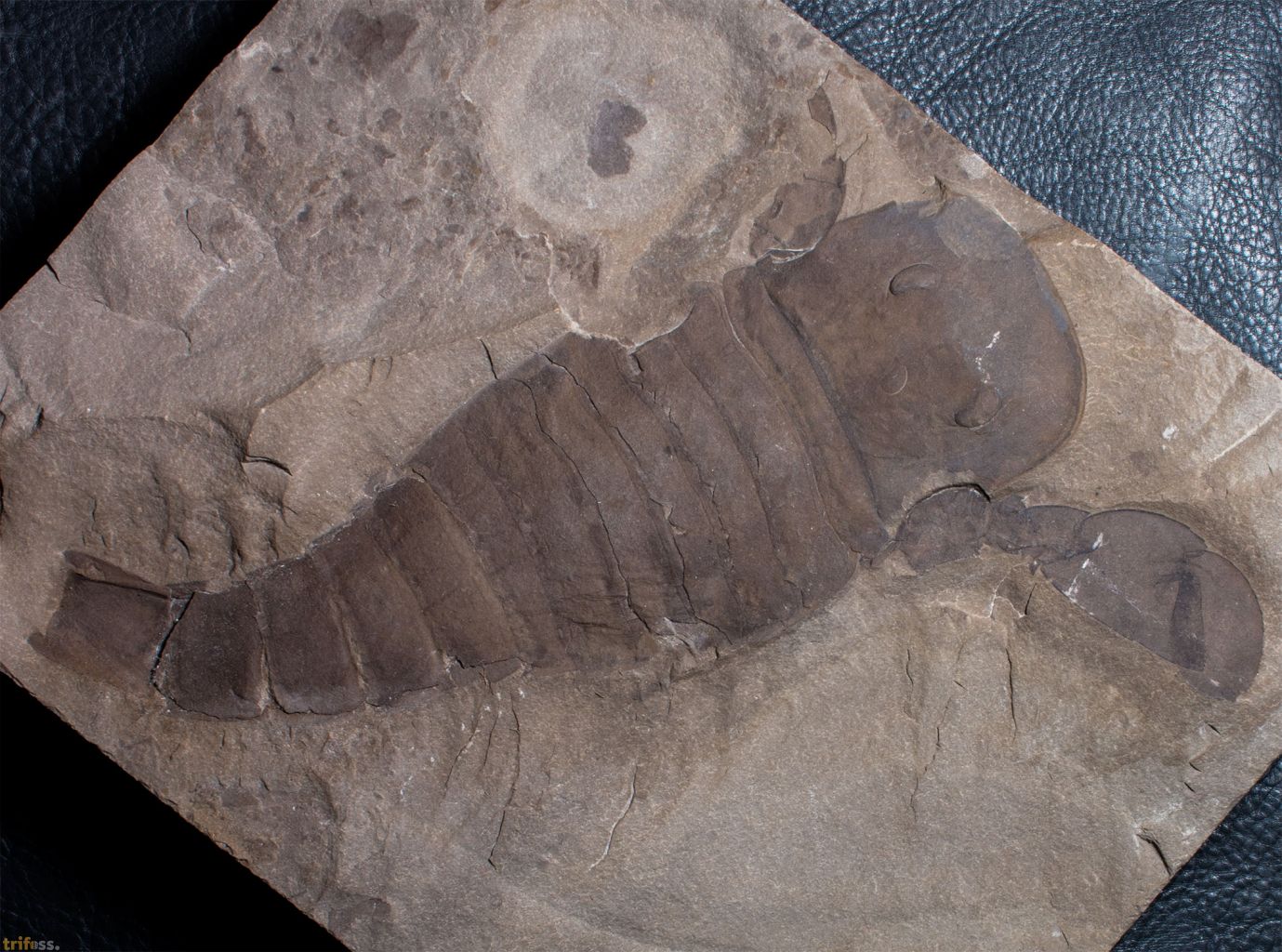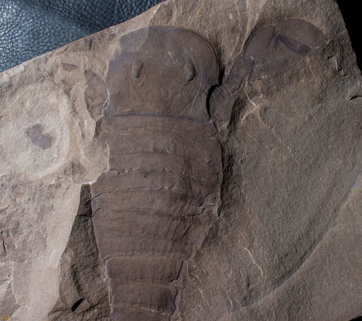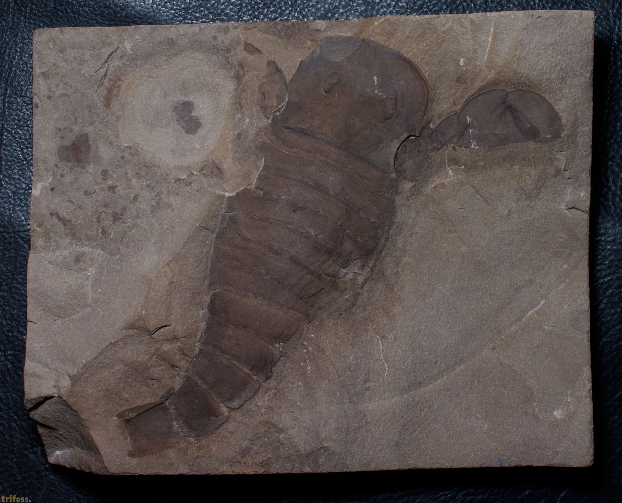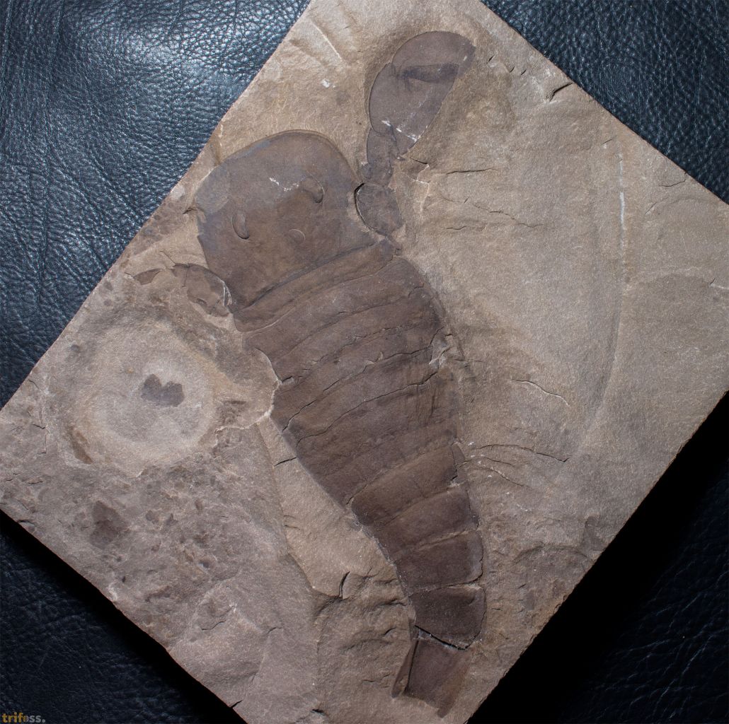 | Dies ist ein Fossils eines großen Eurypteriden der Art Eurypterus remipes aus dem Silur des US Staates New York. Eurypteriden werden auch oft als Seeskorpione bezeichnet. Dieser Eurypterus remipes zeichnet sich durch eine plastische sowie sehr detailreiche Erhaltung aus. Zudem bietet dieses Fossil eine respektable Größe. Entlang der Körperachse gemessen ist dieser Eurypterus remipes etwa 150 mm lang. Vollständig mir dem Telson (Schwanz- Stachel) erhalten, würde dieses Exemplar wohl etwa 210 mm messen. | |||