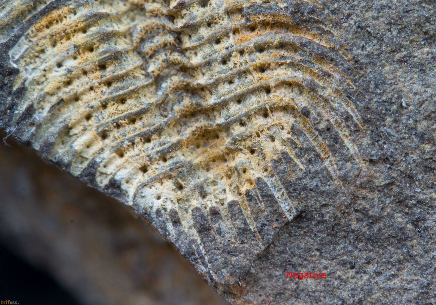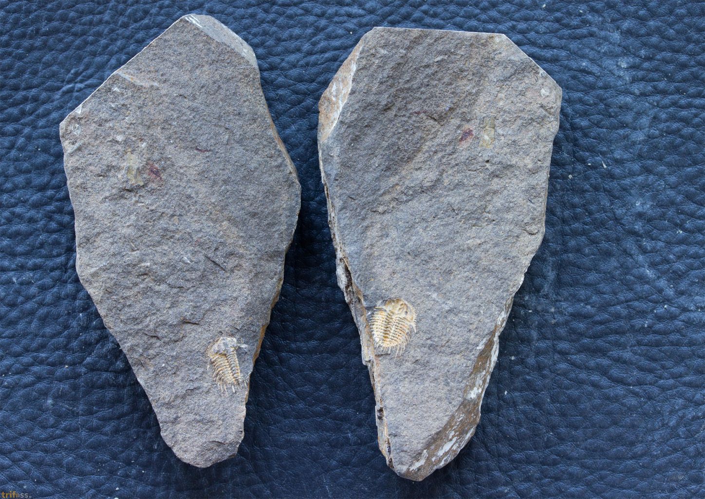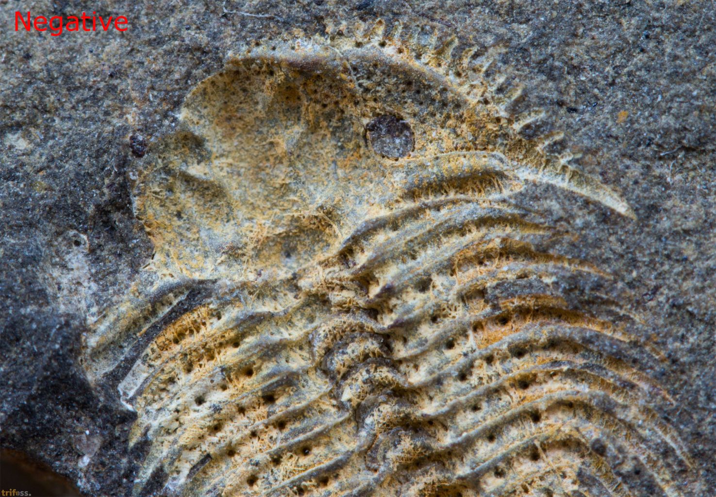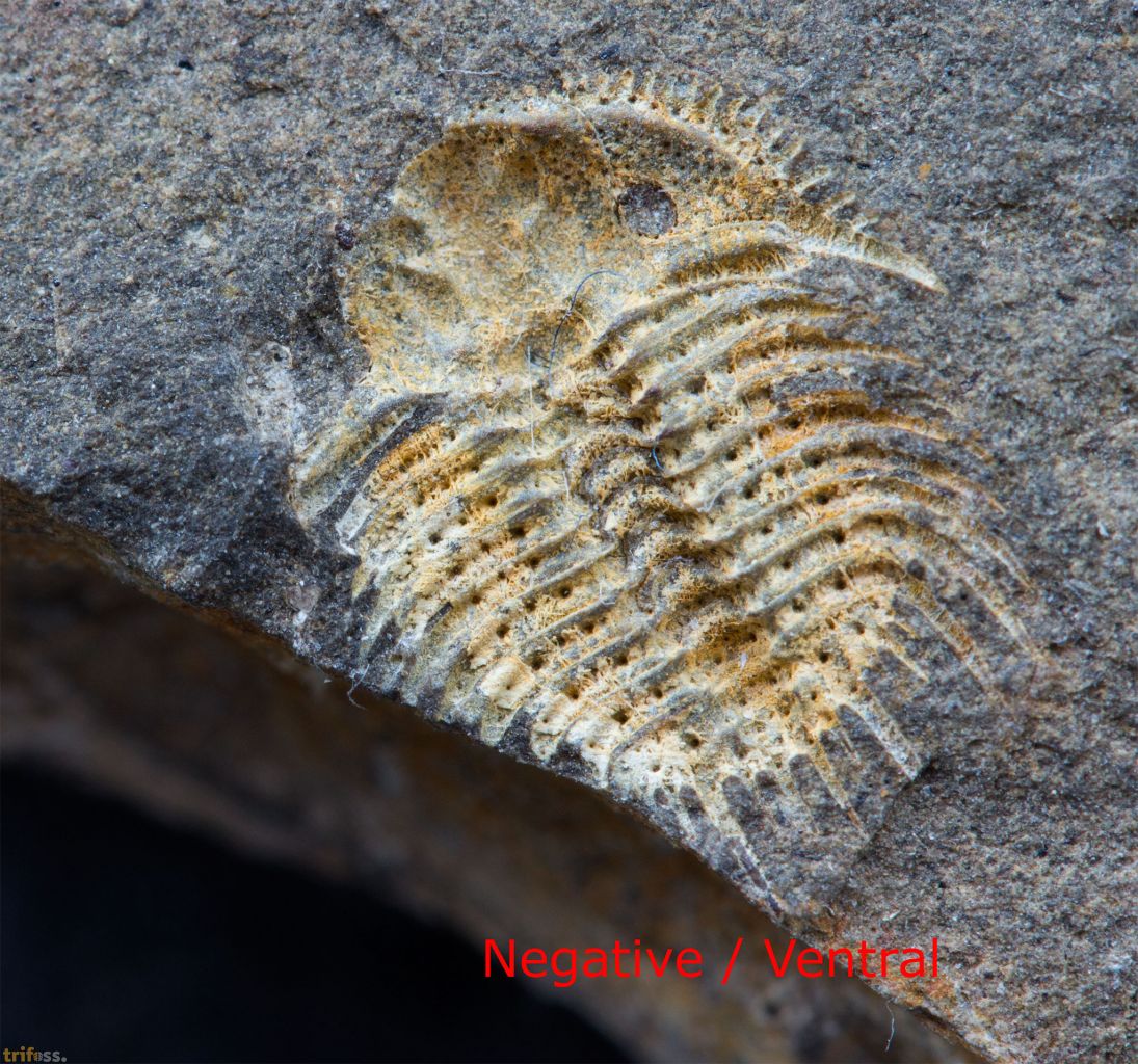 Dies ist ein fantastischer Beleg eines Trilobiten der Art Kettneraspis roemeri mit Positiv- sowie Negativseite. Leider wurde die Positivseite beim Bergen des Fossils beschädigt. Die Negativ- oder Ventral Seite gleicht dies jedoch in der Erhaltung mehr als aus. | |||