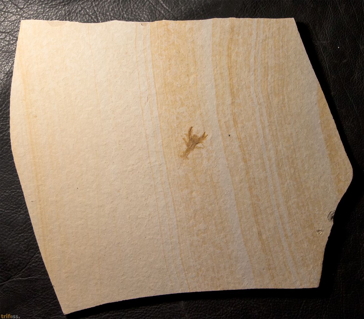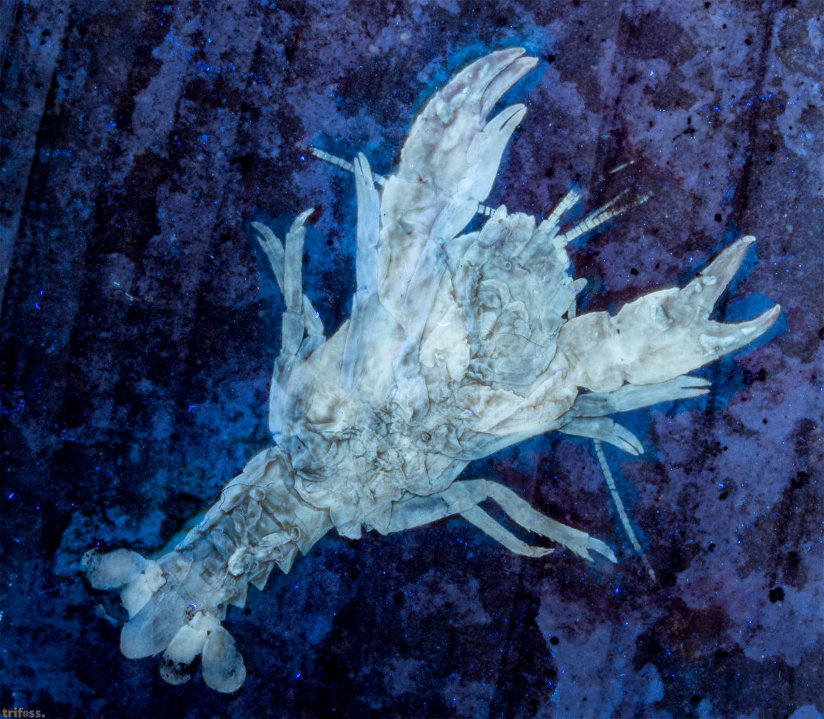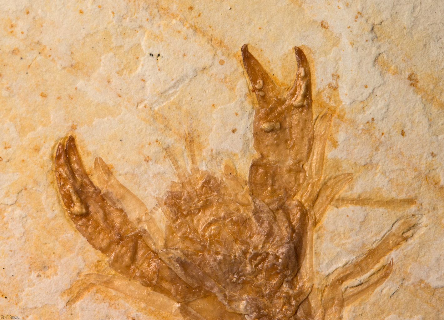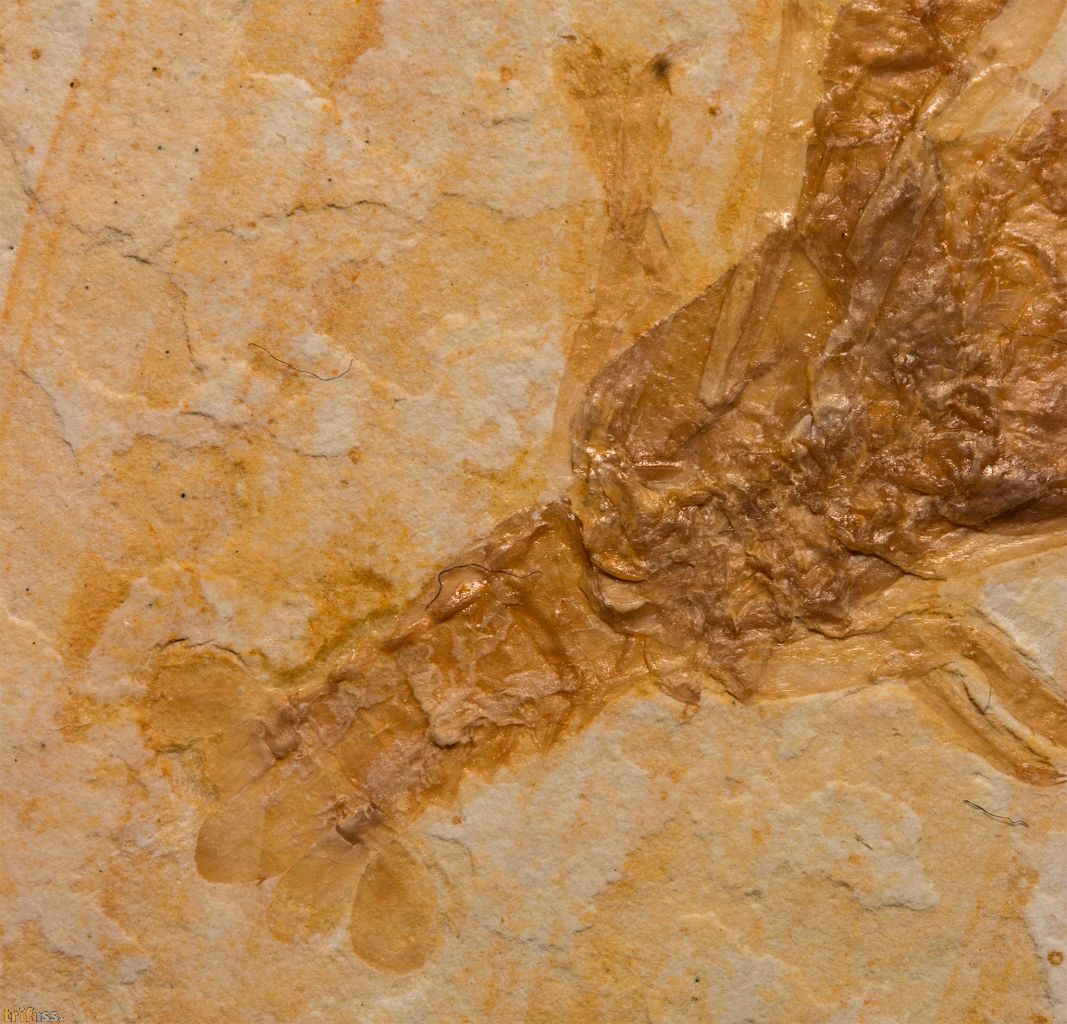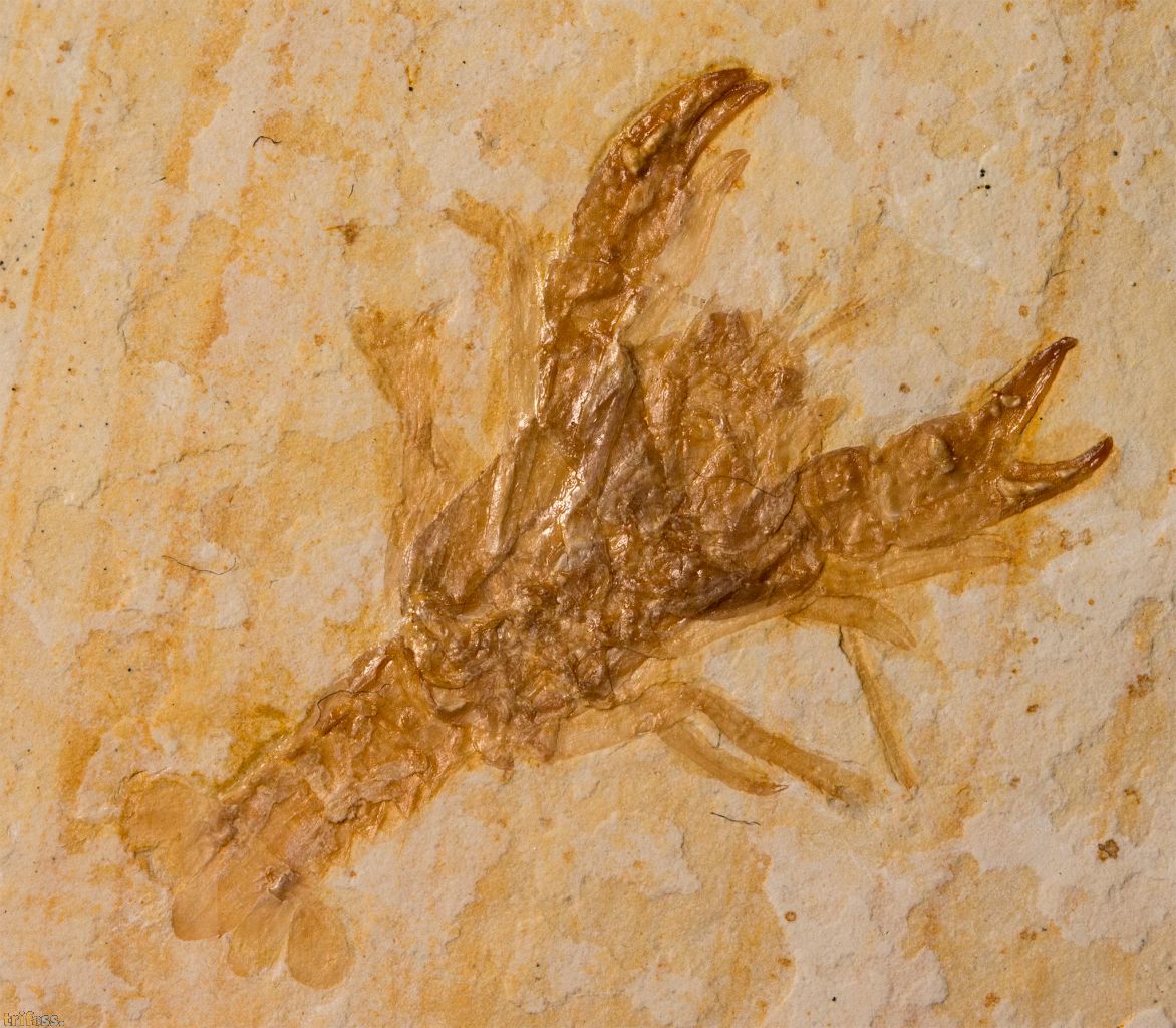 Hier handelt es sich um ein Bilderbuch - Exemplar des Solnhofener - Krebses Pustulina minuta aus Zandt. Der Krebs zeigt eine außergewöhnlich detailreiche Erhaltung und präsentiert sich mustergültig gestreckt von der Ventralseite aus. Beine, Antennen und Scheren sind vollständig und sehr schön dargestellt. Pustulina minuta wird in älterer Literatur gelegentlich noch unter dem veralteten Namen Eryma minuta oder Phlyctosoma minuta geführt. Diese Art war tatsächlich nie besonders häufig. Das vorliegende Exemplar misst etwa 30 mm in der Länge. | |||