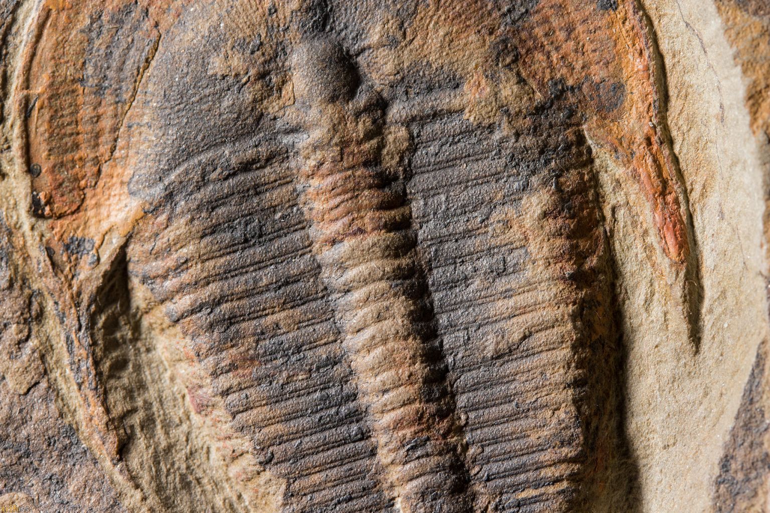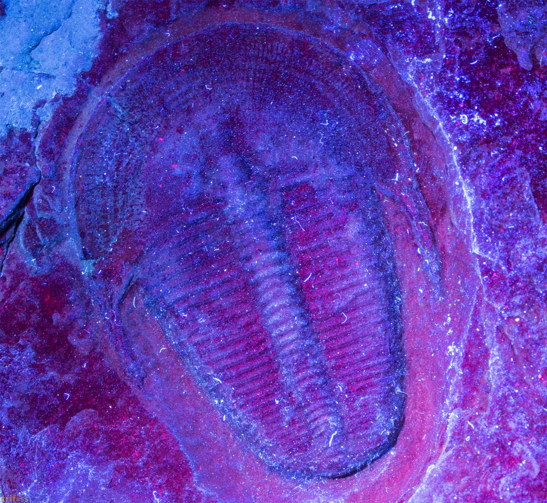| Dies ist ein schönes Exemplar eines seltenen Trilobiten aus Marokko der Gattung Harpides. Das Fossil bietet eine gute, detailreiche Erhaltung. Die UV-Aufnahme zeigt eine saubere Klebung entlang des Fundbruches am linken Rand des Kopfschildes. Der Trilobit selbst misst etwa 49 mm in der Länge. | |||