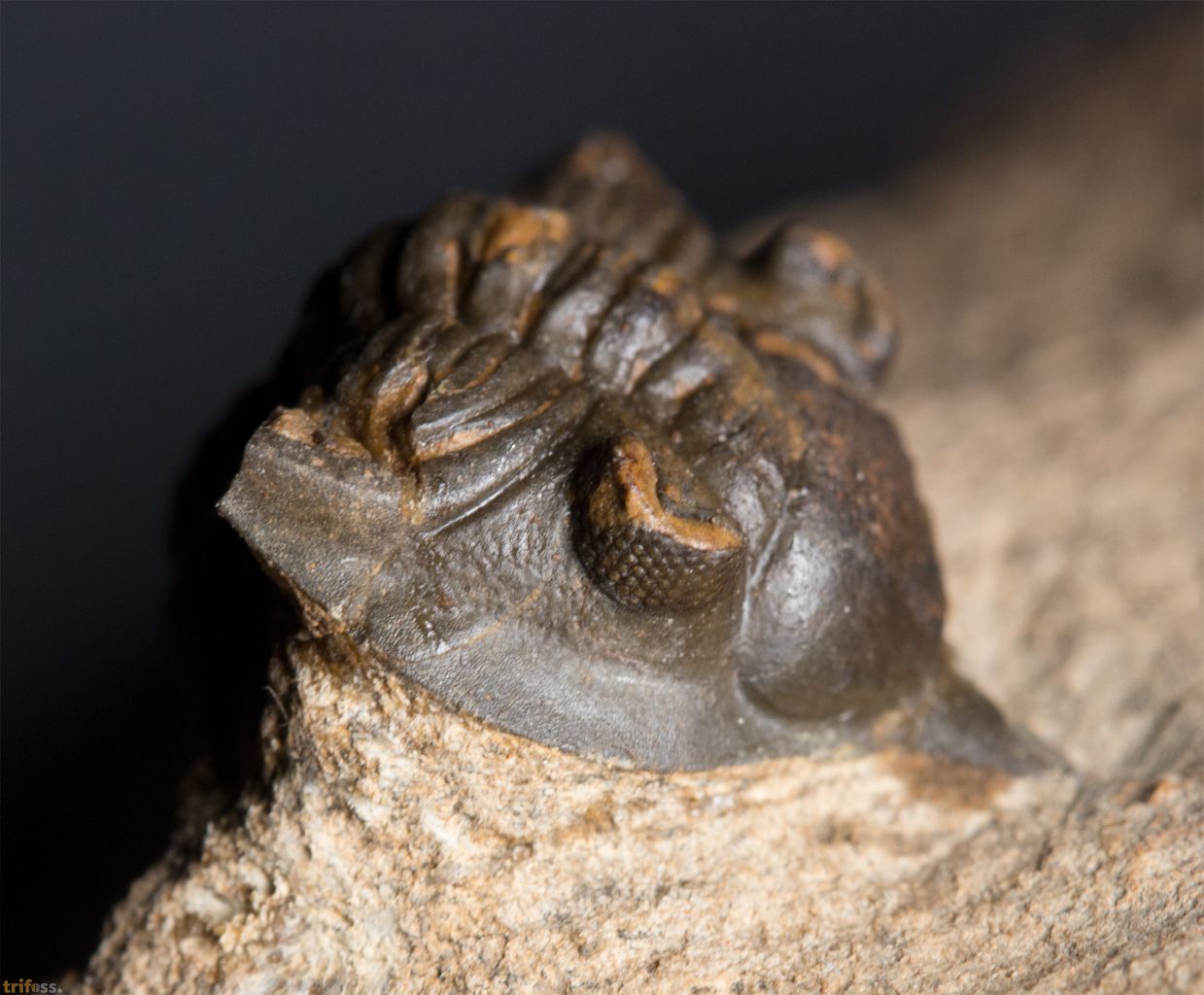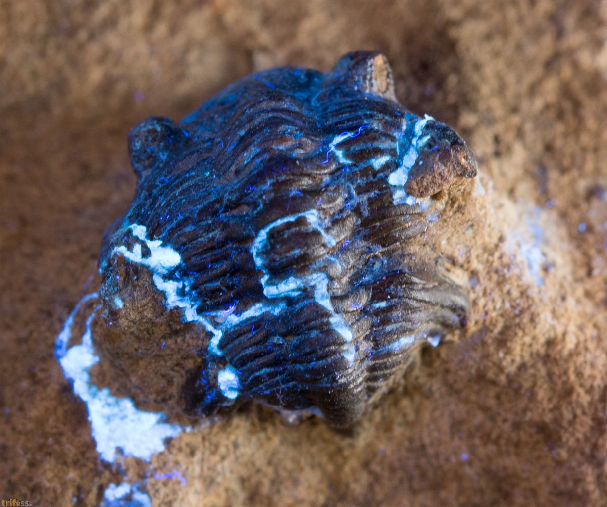 | Dies ist ein preiswerter Trilobit der Art Pseudocryphaeus minimus aus dem Pragium von Marokko. Vollständig gestreckt wäre dieser Trilobit etwa 27 mm lang. Trotz der Fehlstellen zeigt der Trilobit keine Restaurationen. Das UV-Bild zeigt die komplizierten Fundbrüche. | |||