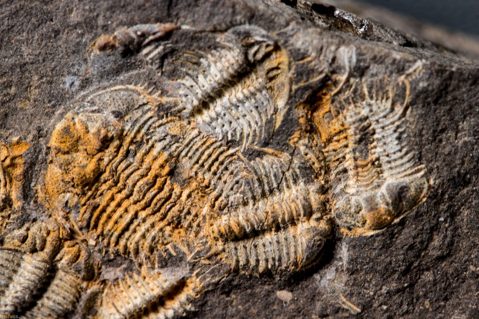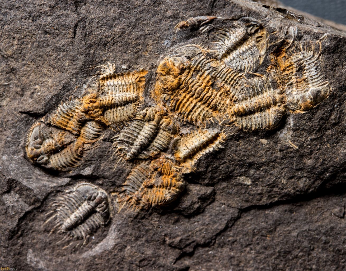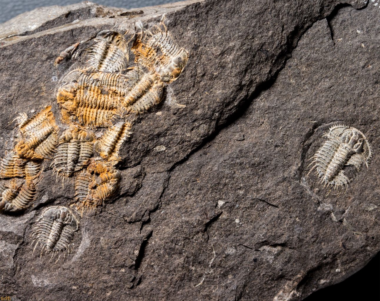 Hier ist ein herausragendes Trilobiten - Cluster mit mehreren Exemplaren der seltenen Art Odontopleura siemangi. Der größte Trilobit auf dieser Platte ist etwa 10 mm lang. Es handelt sich hier um ein seltenes und selten schönes Schaustück. | |||
