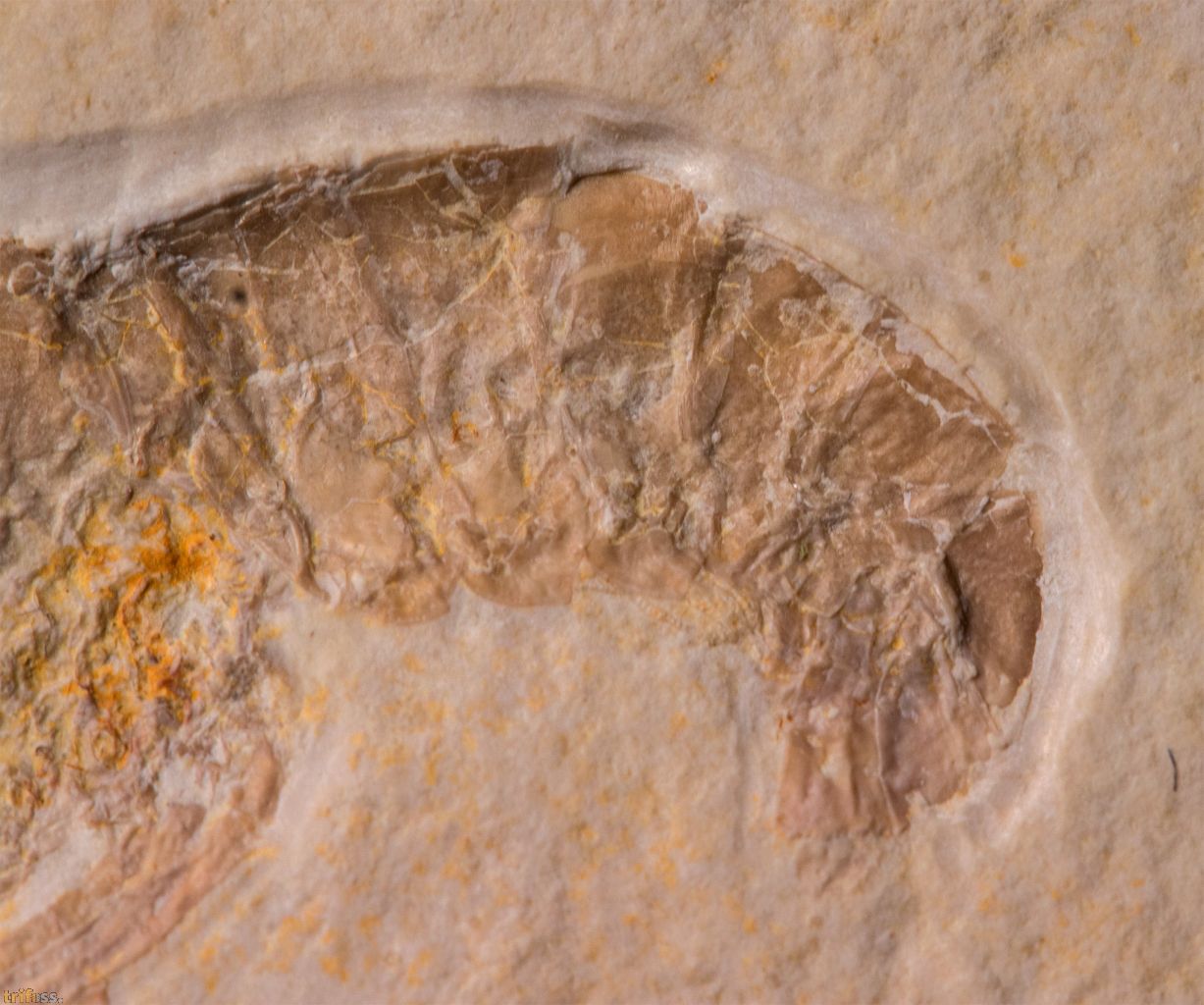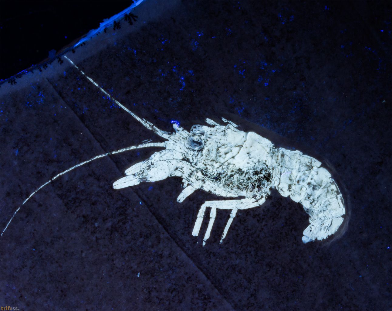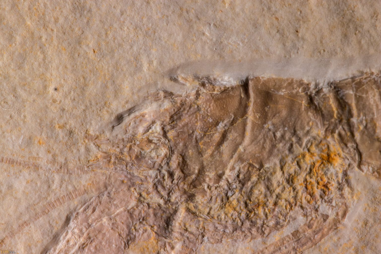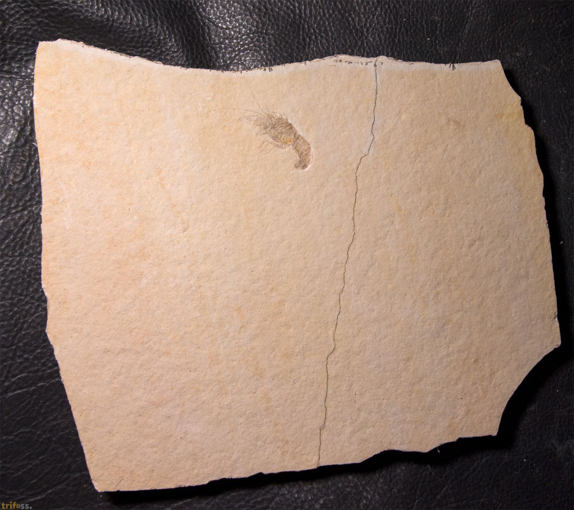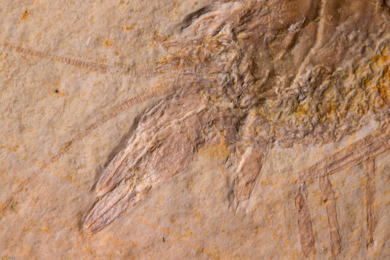 Hier ist ein seltener und detailreicher Pseudastacus pustulosus aus den Plattenkalken von Eichstätt. Der fossile Krebs präsentiert sich in einer Seitenlage und zeigt eine besonders schöne Detailtiefe. Dieser Pseudastacus misst etwa 31 mm, so wie das Fossil auf der Platte liegt. Mit den Antennen sind es ca 42 mm.