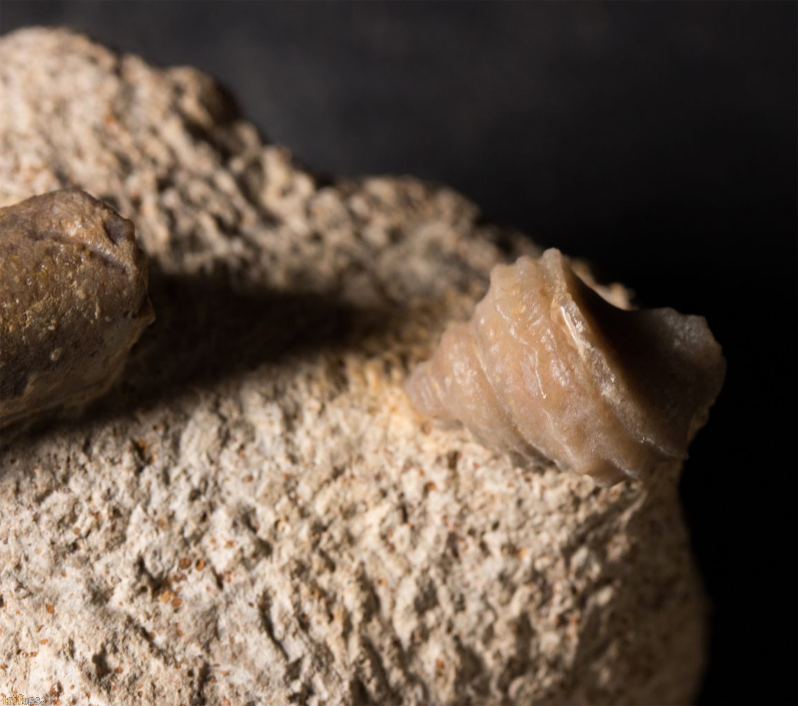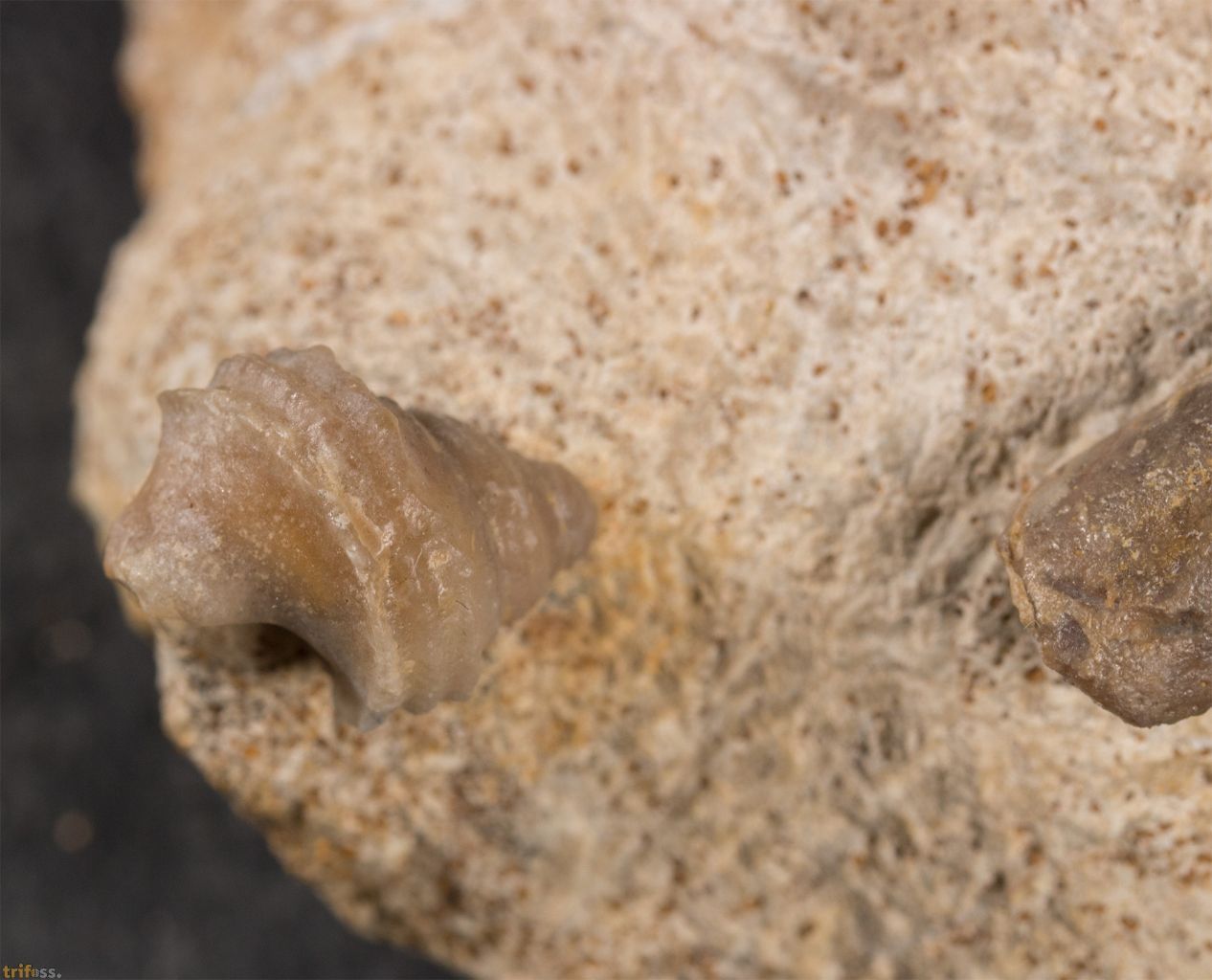Dies ist eine reichhaltige Fossilien-Stufe mit zwei Brachiopoden der Art Sphaeroidothyris sphaeroidalis zusammen mit einem Belemniten welcher wohl zur Gattung Belemnopsis zu stellen ist. Abgerundet wird das Stück durch eine fossile Schnecke der Gattung Dicroloma. Der Belemnit misst etwa etwa 77 mm in der Länge. | |||