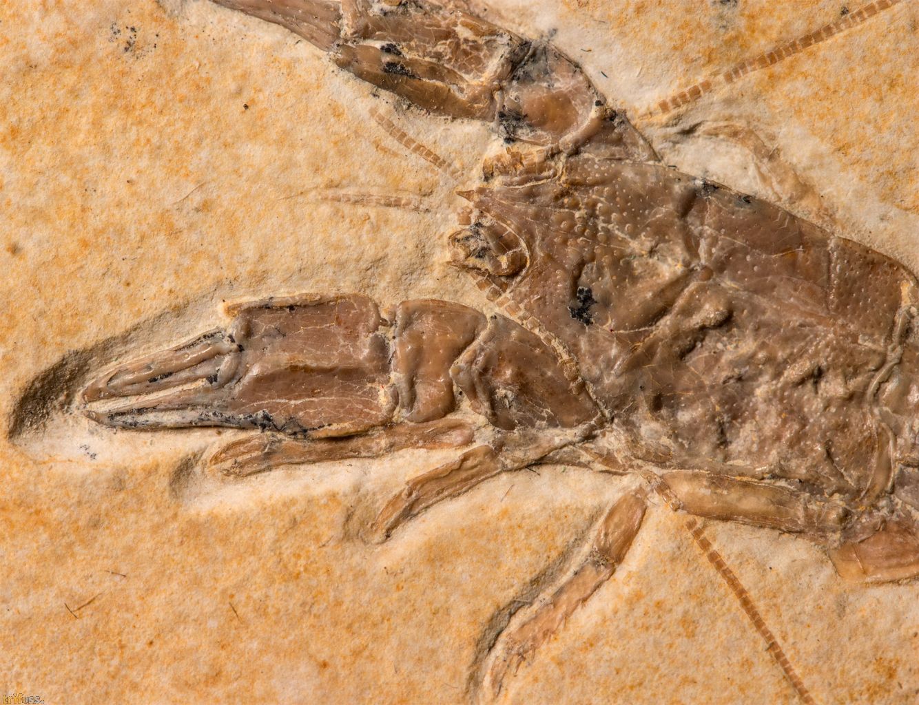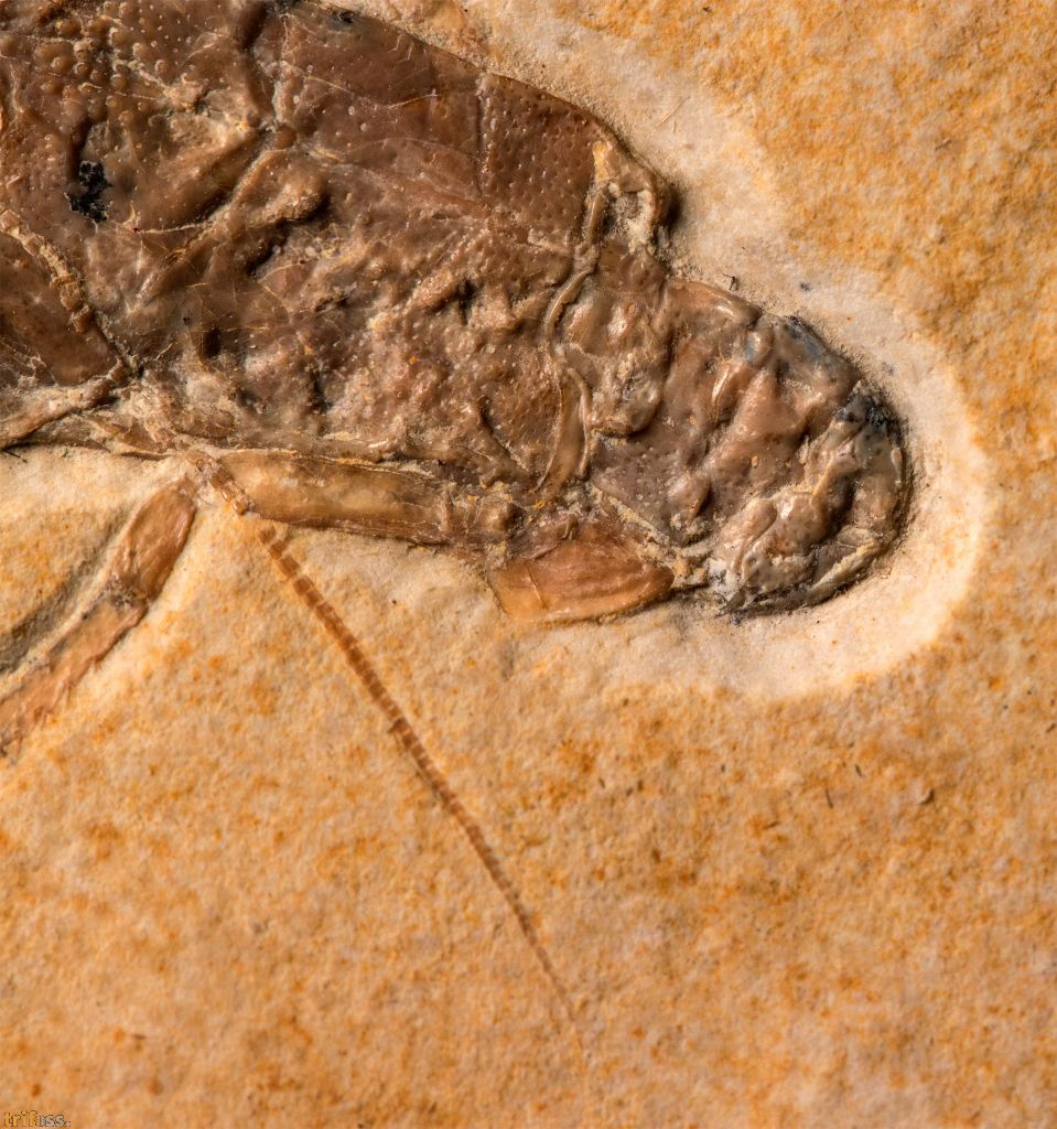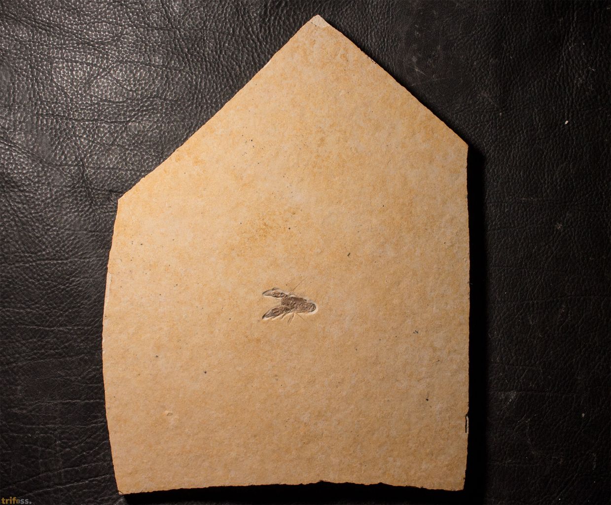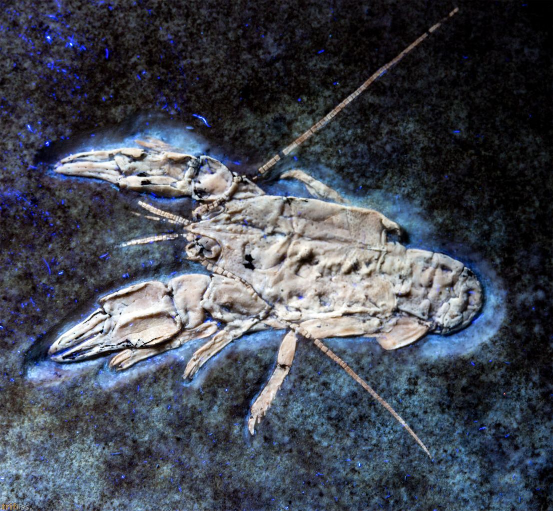Bei diesem Solnhofen - Krebs handelt es sich um ein sehr detailreiches Exemplar der Art Eryma modestiformes. Das UV-Bild zeigt die hervorragende Substanz des Fossils. Der fossile Krebs misst etwa 23 mm, so wie er auf der Platte eingebettet ist. | |||
