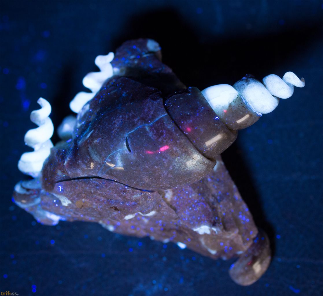 Eine Besonderheit dieser Fundstelle ist die Erhaltung der Schnecken als Chalcedon Pseudomorphosen, bei denen die ursprünglichen Steinkerne überwiegend durch Chalcedon ersetzt wurden. Der Chalcedon zeigt zudem eine starke Lumineszenz unter UV Licht, was die Stücke besonders attraktiv macht. Es ist eine tatsächlich ungewöhnliche und besonders dekorative Erhaltungsform.