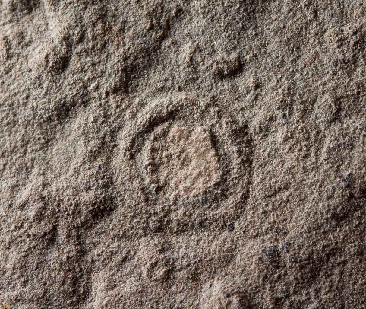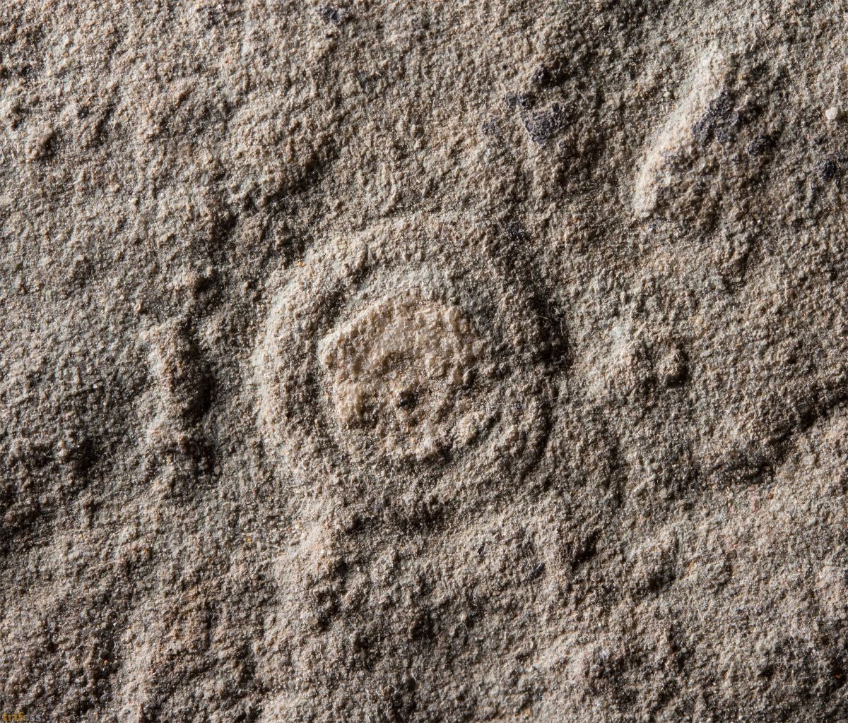 Auf dieser Platte befinden sich ein  Ediacara-Fossil der Art Tirasiana coniformis aus der Ukraine. Außerdem sind einige typische Faltenstrukturen zu erkennen, die als „Wrinkle Structures“ bezeichnet werden. Diese Strukturen entstehen durch Mikrobenmatten während der Einbettung. Die Tirasiana misst etwa 13 mm.
