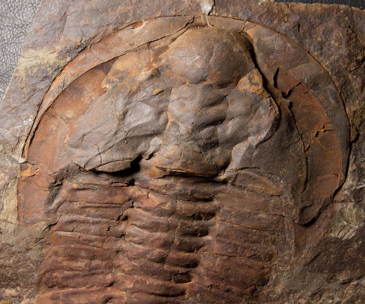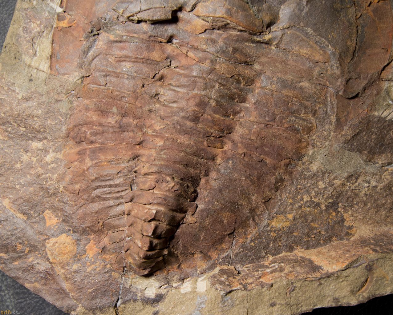 | Dies ist ein sehr großer Marokko Trilobit der Art Cambropallas telesto aus dem mittleren Kambrium des Jebel Ougnate. Das Exemplar zeigt eine gute Erhaltung, insbesondere das Kopfschuld ist schön plastisch erhalten. Entlang der Klebung, etwa auf der halben Länge des Trilobiten sind die Pleuren teilweise restauriert. Also 2 Pleuren teilweise repariert, Fehlstellen in der Klebung wurden restauriert. Auch drei Spindelringe sind teilweise restauriert. Große Trilobiten aus der Jbel Wawrmast Fm. Werden selten verlustfrei geborgen. Der Trilobit selber ist etwa 196 mm lang, und kommst mit Positiv- sowie Negativseite. | |||