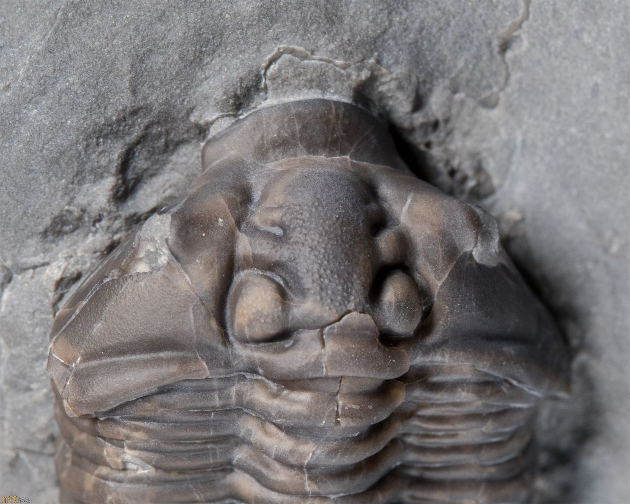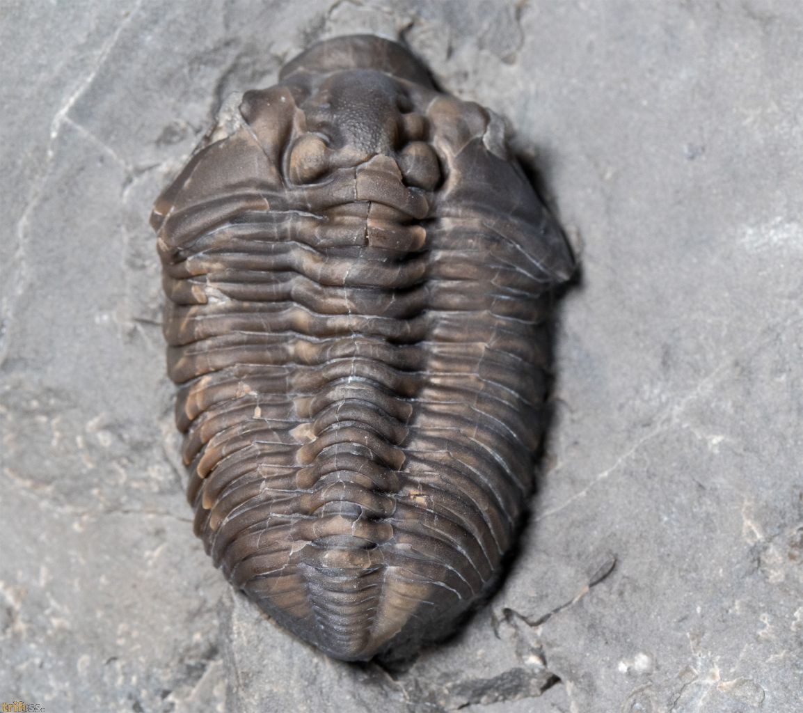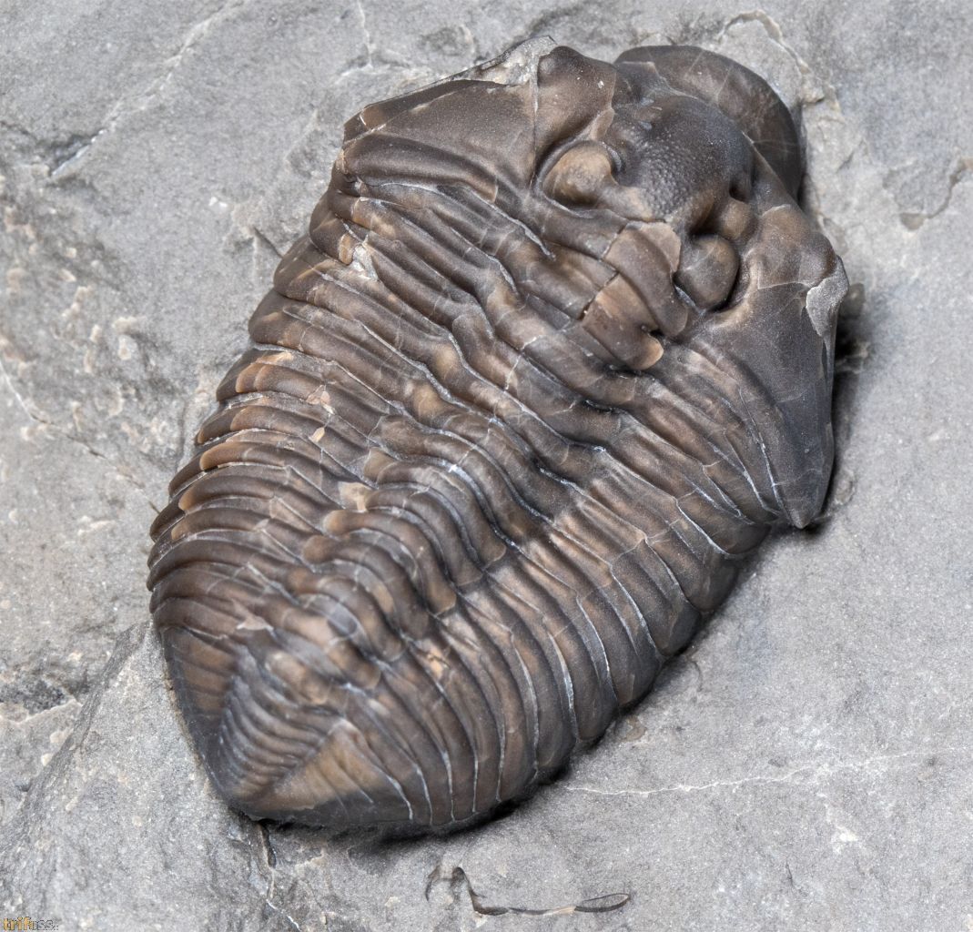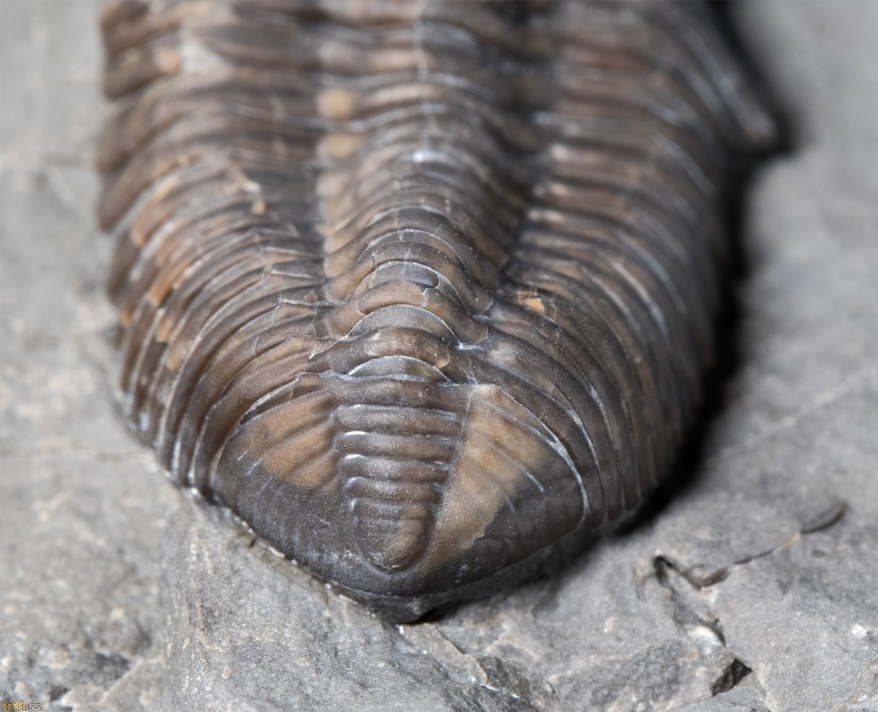 Hier ist ein schöner und detailreicher Trilobit der Art Flexicalymene senaria aus der Verulam - Formation von Kanada. Der Trilobit ist etwa 19 mm breit und wäre vollständig getreckt etwa 30 mm lang. | |||