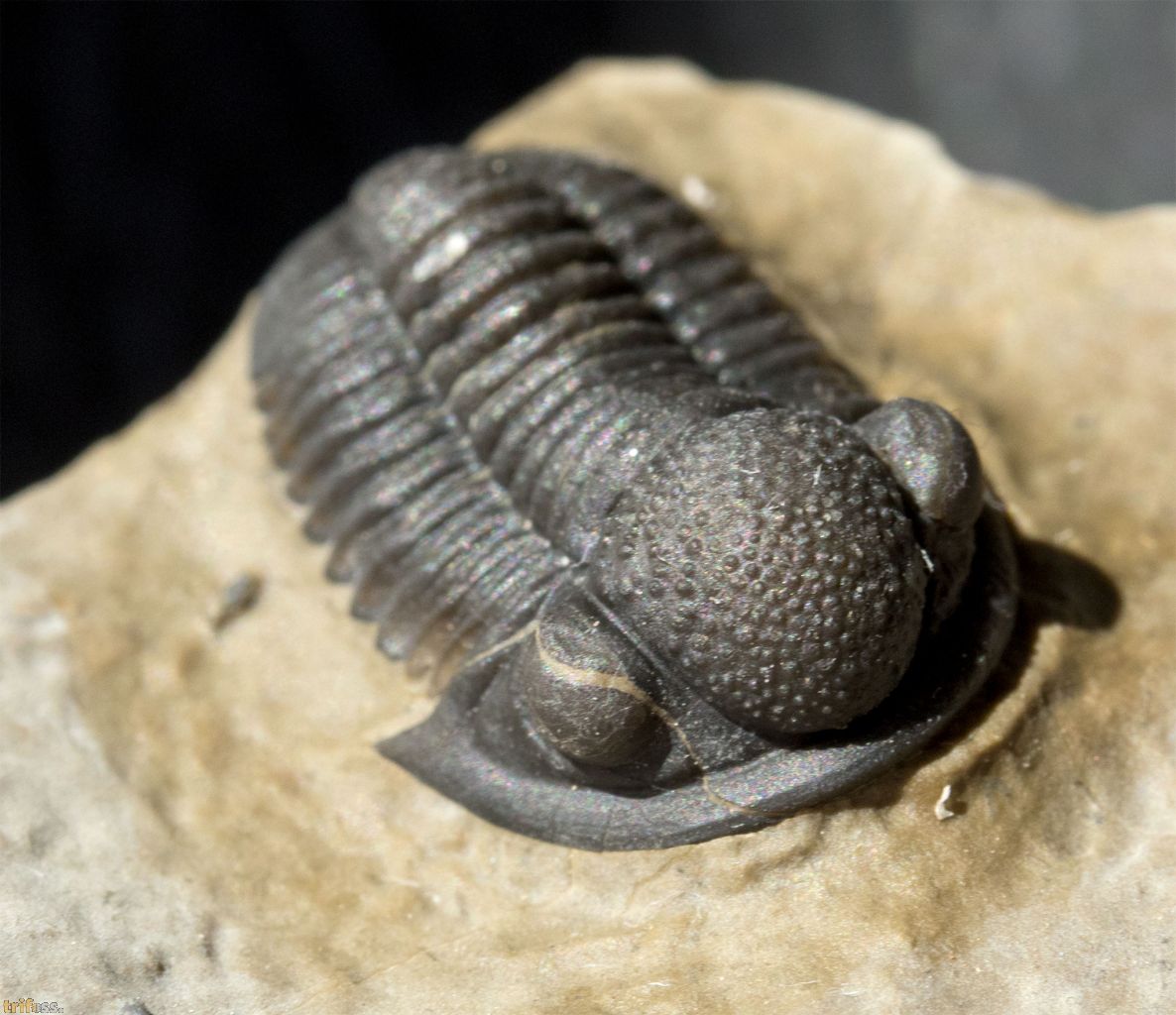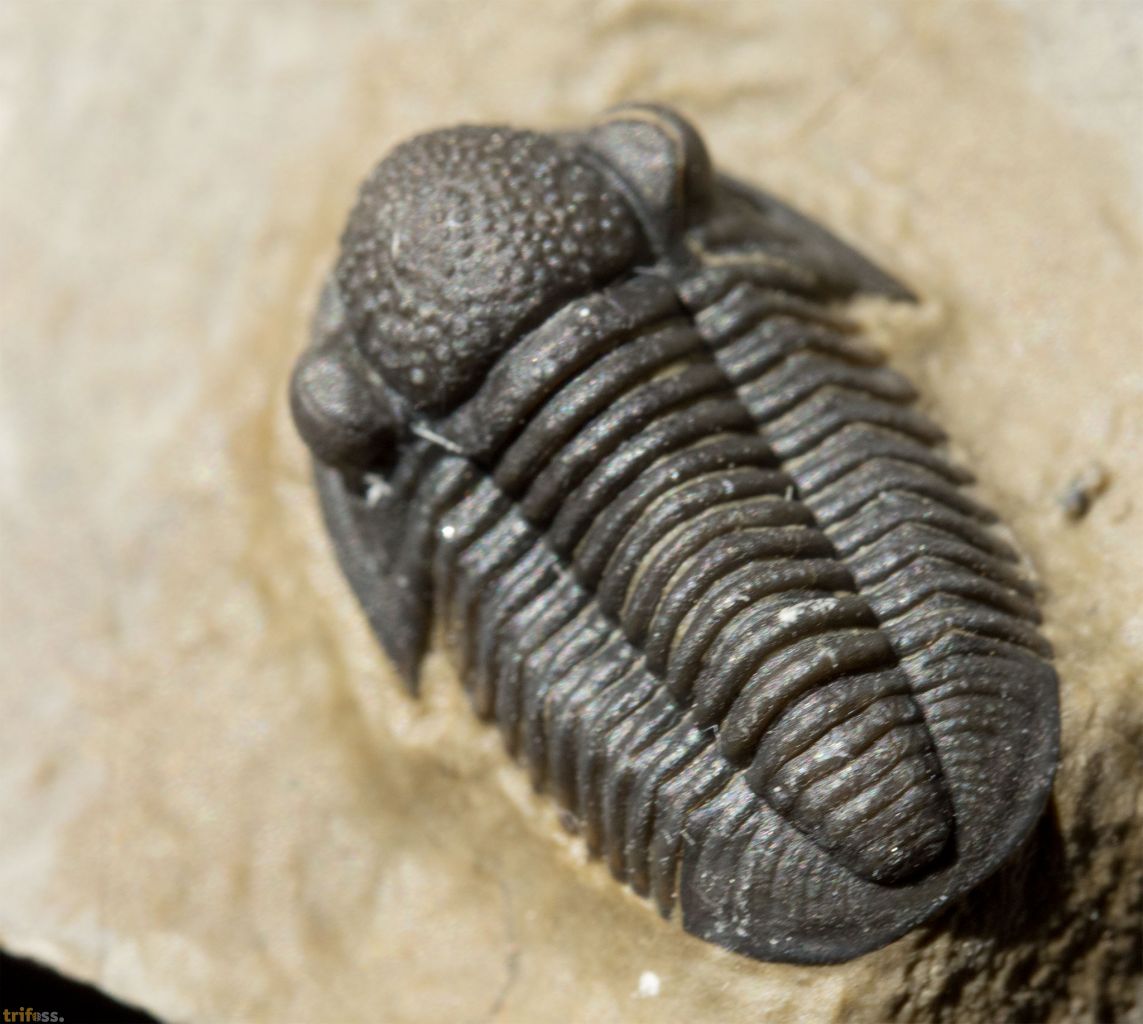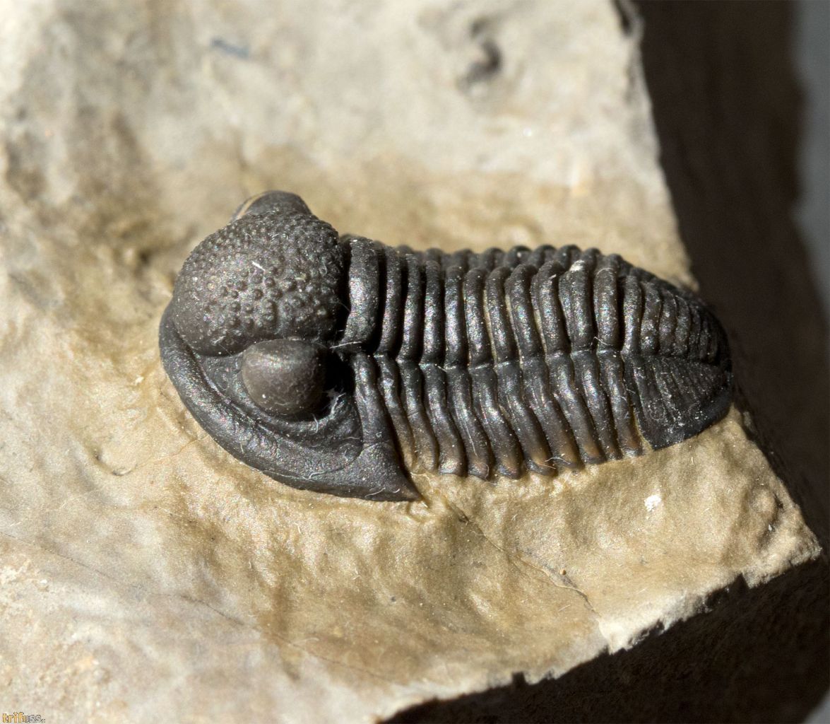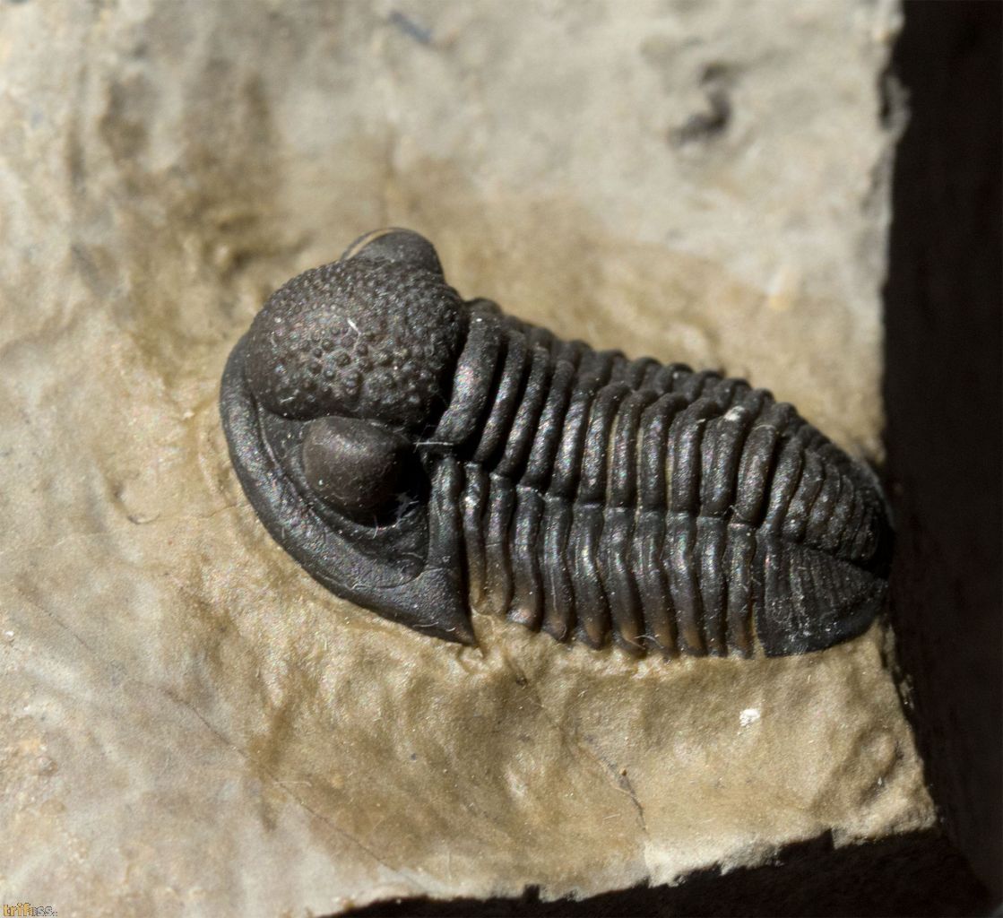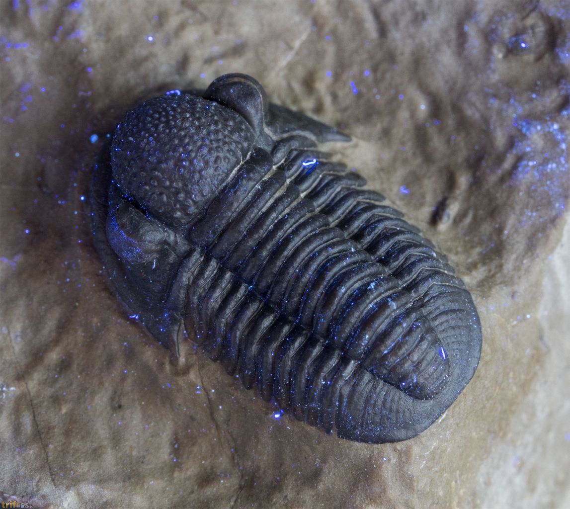 | Dies ist ein erstklassiger Marokko‑Trilobit der Art Gerastos tuberculatus marocensis aus der Timrhanrhart‑Formation des Jebel Zguilma. Das UV‑Bild zeigt keinerlei Auffälligkeiten. Der Trilobit besitzt nicht einmal eine Klebung, was tatsächlich eher die Ausnahme darstellt. Der Gerastos selbst misst etwa 19 Millimeter in der Länge. | |||