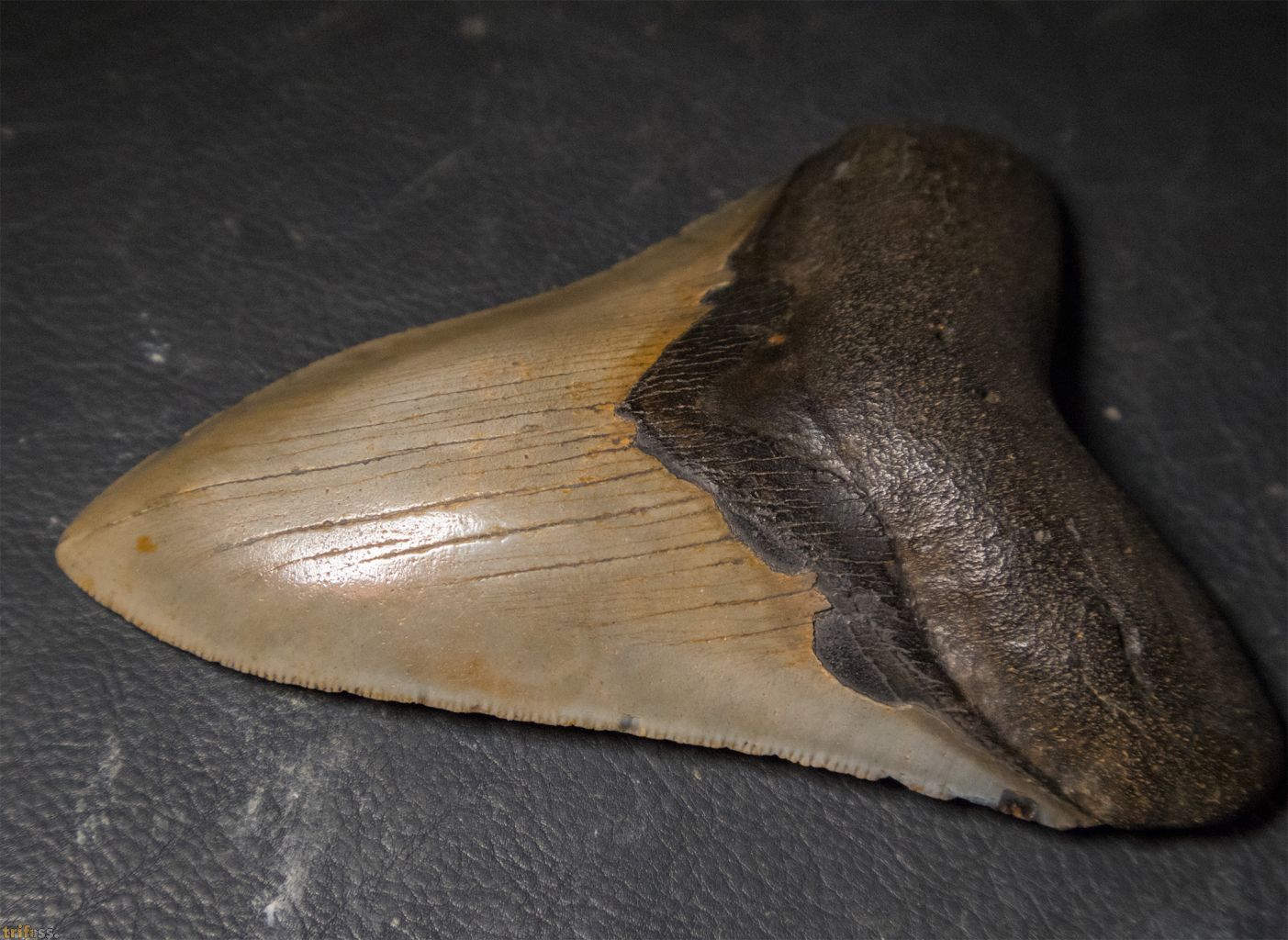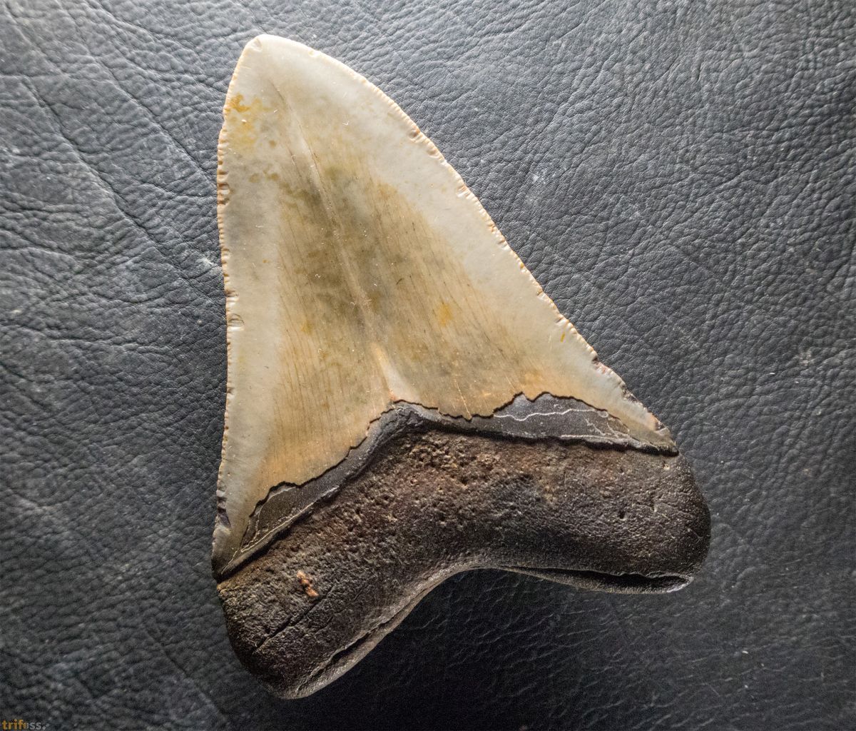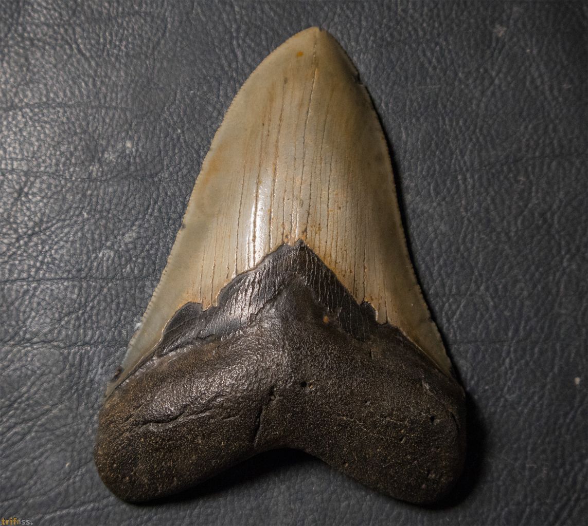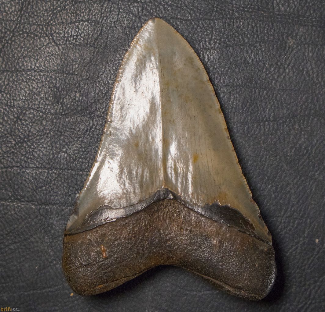 | Dieser Megalodon Zahn ist etwa 117 mm groß und zeigt eine hervorragende Erhaltung sowie eine schöne, helle Färbung. Er misst damit ungefähr 4,5 Zoll. Die Länge von Megalodon-Zähnen wird traditionell entlang der Schneide gemessen. Diese Messmethode ergibt zum einen häufig einen größeren Wert, ist jedoch vor allem besser für Vergleiche geeignet. Bei Megalodon-Zähnen variiert das Verhältnis von Breite zu Länge erheblich, sodass eine Messung im 90‑Grad-Winkel von der Wurzel zur Spitze nicht immer die tatsächliche Größe widerspiegelt. Unten geben wir zusätzlich das Verhältnis von Breite zur Länge an. | |||